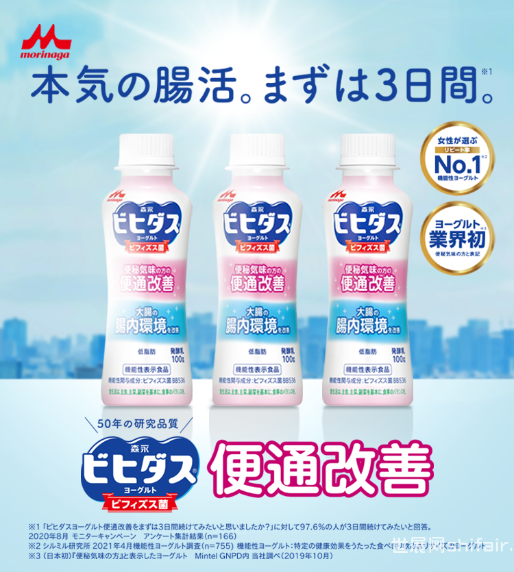 图源:Eat&Foods官网 15、ビヒダスヨーグルト便通改善(bifidus酸奶便通改善)森永乳业将推出的“bifidus酸奶便通改善饮”是一款功能性食品,声称可以通过改善便秘者的肠道蠕动从而改善便秘问题。酸奶具有调节肠道的作用是众所周知的,但这款产品是酸奶行业中第一个明确标明改善便秘功能的产品。产品除了含有20亿个森永乳业自主研发的“双歧杆菌BB536”,还配合上牛奶低聚糖,是一款低脂酸奶。上市日期:2021年4月7日售价:100g/133JPY