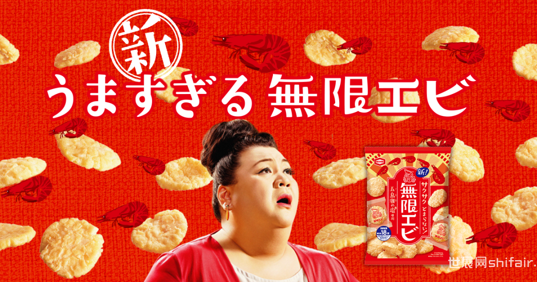 图源:Yakult官网 17、無限エビ(无限虾)龟田制果旗下的无限虾是一种以突显香虾的美味的特色仙贝零食。通过将连壳鲜虾压碎揉进面团,从而获得一款口感独特而风味丰富,让人一吃就停不下来的“上瘾”小吃。此外,该产品还添加了 “五岛滩盐”,其味道醇厚,咸味少的特点更加增强了虾的鲜味。上市日期:2021年2月22日售价:83g/200JPY