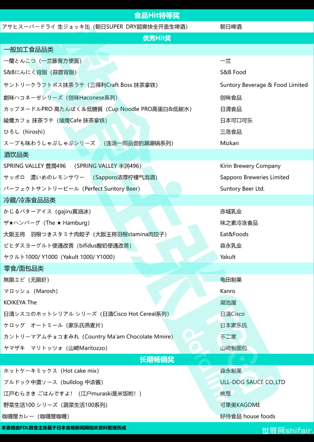 12月22日本食粮新闻公布了“第40届食品ヒット大賞(食品Hit大赏)”获奖名单。食品Hit大赏是1982年(昭和57年)为纪念《日本食粮新闻》创刊40周年而设立的奖项。由全国100多家食品企业及各大经销商通过监测一年内(1-12月)食品行业各类产品的表现推荐参选产品,再由内部专家委员会根据推荐名单确定最终获奖产品。奖项评选标准主要包括:(1)创造新需求、(2)助力市场振兴、(3)促进销售增长、(4)有效的营销手段、(5)行业领导者、(6)面向行业/商业新方向的新颖性六个方面。大赏设置了食品Hit特等奖,优秀Hit奖,长期畅销奖三个奖项。本届共有29个产品获奖,其中朝日啤酒推出的スーパードライ 生ジョッキ缶(朝日SUPER?DRY超爽快全开盖生啤酒)以压倒性的票数斩获空缺3年的食品Hit特等奖。