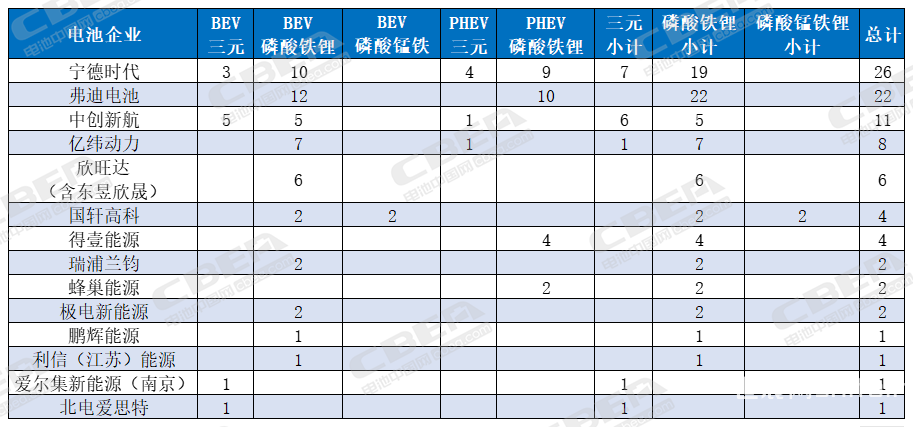 从新能源乘用车电池配套企业来看,宁德时代配套26款、弗迪电池配套22款、中创新航配套11款、亿纬动力配套8款、欣旺达配套6款(含东昱欣晟)、国轩高科/得壹能源各配套4款、瑞浦兰钧/蜂巢能源/极电新能源各配套2款、鹏辉能源/利信(江苏)能源/爱尔集新能源(南京)/北电爱思特各配套1款。其中,有多款车型由2家电池企业共同配套。上榜动力电池企业配套热门乘用车型情况