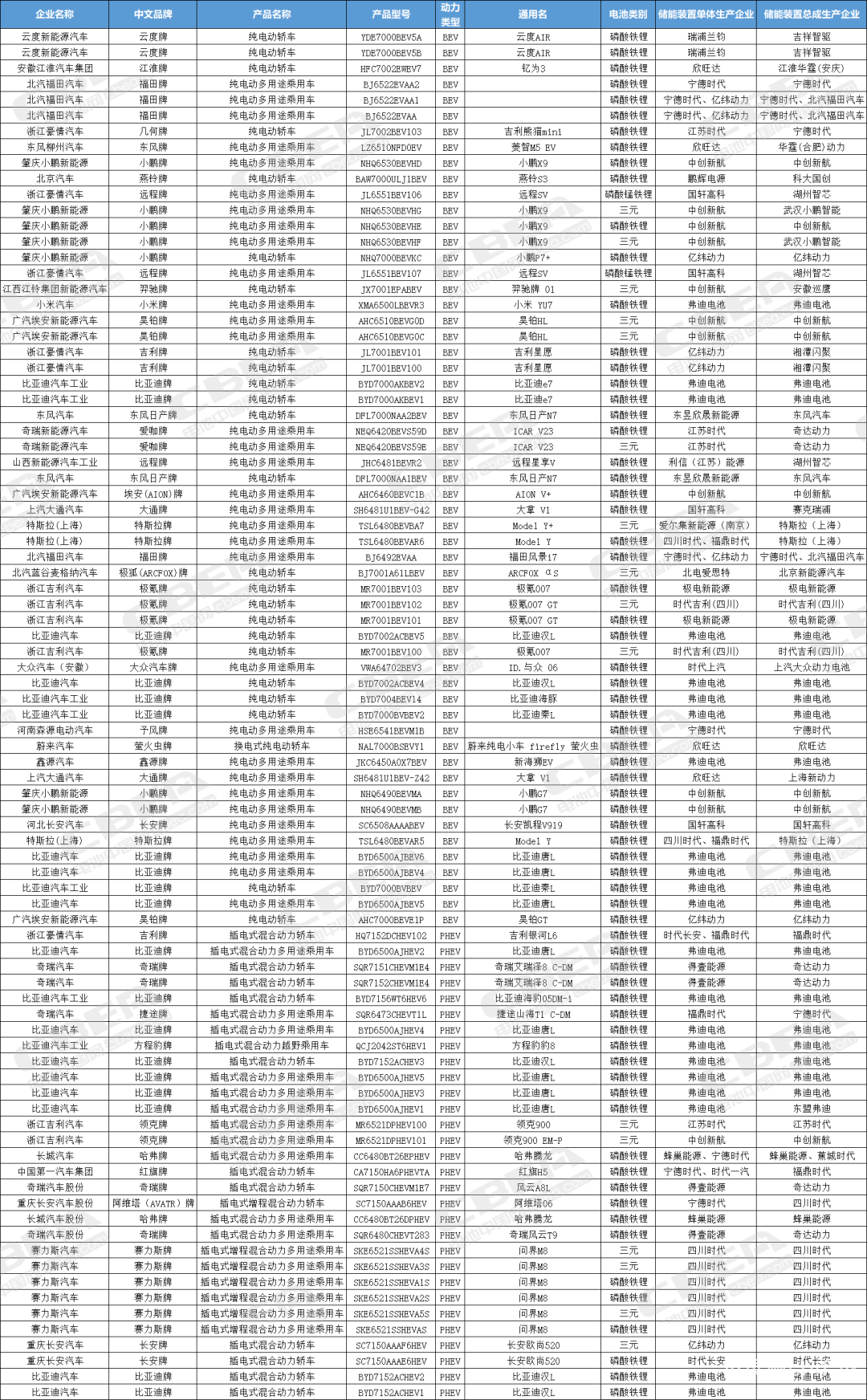此次公告的配套电池企业中,极电新能源、利信(江苏)能源都是吉利旗下的电池企业,得壹能源则是奇瑞旗下的一家电池生产企业。除得壹能源外,奇达动力也是“奇瑞系”的一家电池企业,此次公告出现在多个车型的储能装置总成企业列表中。业界人士表示,一方面,车企通过培育自己的电池企业,希望更好地掌控电池这一核心零部件,以提高电池供应的稳定性;另一方面,这类电池企业在技术成熟度、市场验证、规模化降本等方面仍面临不小的挑战。市场方面,背靠车企,随着这类电池企业产的电池陆续装车,动力电池市场竞争格局或将发生一些变化。配套电池其它看点从配套电池类别看,第391批公告中,磷酸铁锂电池车型在新能源乘用车总车型中的占比约为79.3%,较去年首批(第379批)公告中51.8%的占比,提高27.5个百分点。随着国内磷酸铁锂电池车型的续航里程突破700公里,未来,磷酸铁锂电池或将发挥更大潜能。从新能源乘用车类别看,此次公告中,插混车型(含增程)有30个型号,占新能源乘用车新车型总量约34.5%。插混车型(含增程)中,问界M8、领克900等车型配套电池包的带电量≥50kWh,体现了插混车型搭载大电量电池包,成为中高端车型的发展趋势之一。另如,蜂巢能源大电量800V越野插混专用电池包近期配套坦克500Hi4-Z,据报道,该电池包电量为59kWh。此外,海外电池企业方面,此次公告中出现韩国电池企业LG新能源、SK On的身影。其中,爱尔集新能源(南京)为LG新能源旗下电池企业,此次为特斯拉Model Y+提供三元锂电池;从股权穿透的角度看,北电爱思特的股东包括SK On、北汽集团等,此次其为极狐新车型提供的是三元锂电池。业内人士表示,受当前国内汽车领域消费意愿不足、国际贸易壁垒高筑等因素影响,当前新能源汽车国内外销量增速均有所放缓。在此背景下,新能源汽车行业的竞争或将进一步加剧,车企经营压力也将持续加大,而新能源新车型的密集上市,或将有助于提振汽车市场消费意愿。整体看,本轮乘用车价格战已行至中场,成本红线压力下,很多车企已降无可降,超充等先进电池技术或将在今年搅动乘用车市场格局。乘用车竞争态势愈发白热化,随着热门新车型的加入,谁将成为市场新宠,我们拭目以待!第391批公告新能源乘用车车型如下: