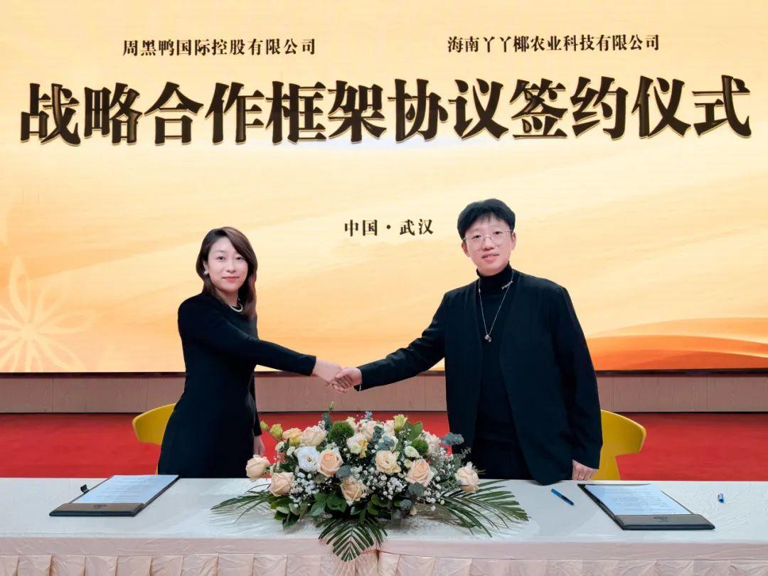 近日,“周黑鸭”与“IMCOCO”战略合作签约仪式在武汉“周黑鸭”总部举行,双方将联合推出天然椰子水品牌“丫丫椰”。报道称,此次战略合作,标志着“周黑鸭”开启“卤味+饮料”的全新消费场景,旨在提升消费者的美味体验,并满足更多场景化、多元化的需求;不仅为“周黑鸭”的业务升级注入活力,也为卤味行业的跨界融合树立了新标杆。“丫丫椰”作为“周黑鸭”的专属饮料品牌,其产品将在“周黑鸭”零售门店及合作渠道全面发售。