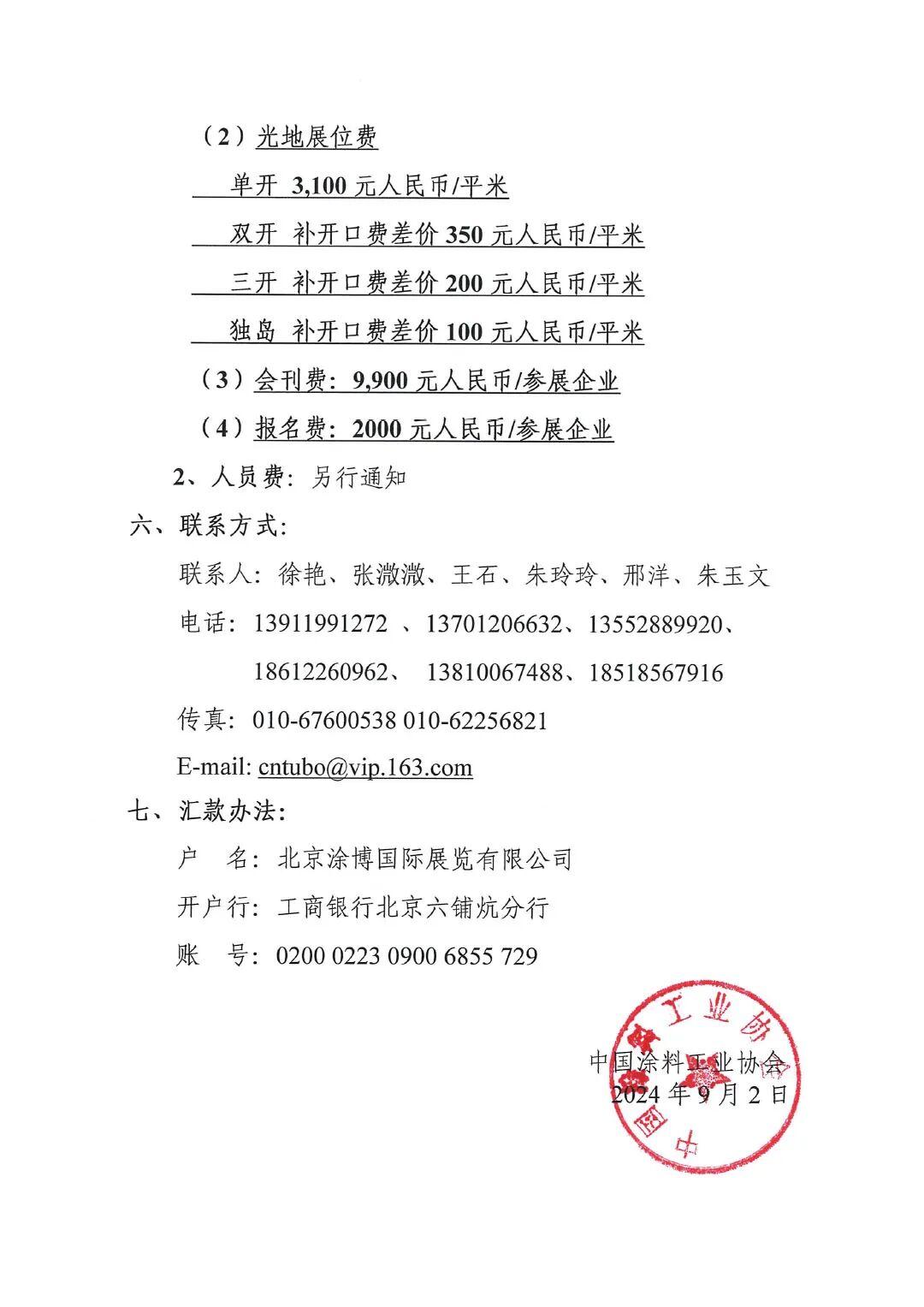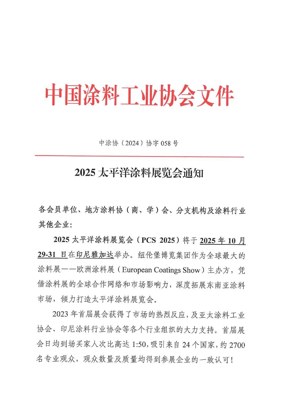 |通知中涂协(2024)协字058号各会员单位、地方涂料协(商、学)会、分支机构及涂料行业其他企业: 2025太平洋涂料展览会(PCS 2025)将于2025年10月29-31日在印尼雅加达举办。纽伦堡博览集团作为全球最大的涂料展——欧洲涂料展(European Coatings Show)主办方,凭借涂料展的全球合作网络和市场影响力,深度拓展东南亚涂料市场,倾力打造太平洋涂料展览会。 2023年首届展会获得了市场的热烈反应,及亚太涂料工业协会、印尼涂料行业协会等各个行业组织的大力支持。首届展会日均到场买家人次比高达1:50,吸引来自24个国家,约2700名专业观众,观众数量及质量均得到参展企业的一致认可! 一、展会基本信息: 展会名称:2025太平洋涂料展览会(PCS 2025) 展会时间:2025年10月29-31日 展会地点:印尼雅加达 二、展出内容: 涂料原料、助剂、印刷油墨原材料、胶黏剂和密封剂、填料、颜料、树脂、增粘剂、建筑和化工用品、实验和生产设备、测试与测量设备、溶剂回收和排放处理、环境保护和职业安全。 三、展期活动: 为促进中国与印尼涂料行业企业交流,帮助中国企业更好的了解印尼涂料市场,展会期间将安排丰富多彩的商务论坛交流及对接活动。中国参展企业将通过与当地企业面对面交流洽谈,深入了解印尼当地市场的贸易形势及市场发展趋势,进一步促进中国与印尼间的贸易往来,促进国内企业技术发展。 四、报名截止日期:售完为止 五、参展费用: 1、展位费: (1)标准展位费: 单开 4,400元人民币/平米 双开 补开口费差价400元人民币/平米 三开 补开口费差价200元人民币/平米 独岛 补开口费差价100元人民币/平米 (2)光地展位费 单开 3,100元人民币/平米 双开 补开口费差价350元人民币/平米 三开 补开口费差价200元人民币/平米 独岛 补开口费差价100元人民币/平米 (3)会刊费:9,900元人民币/参展企业 (4)报名费:2000元人民币/参展企业 2、人员费:另行通知 六、联系方式: 联系人:徐艳、张溦溦、王石、朱玲玲、邢洋、朱玉文 电话:272 、632、920、962、 488、916 传真: E-mail:.com 七、汇款办法: 户 名:北京涂博国际展览有限公司 开户行:工商银行北京六铺炕分行 账 号: 6855 729中国涂料工业协会2024年9月2日通知文件