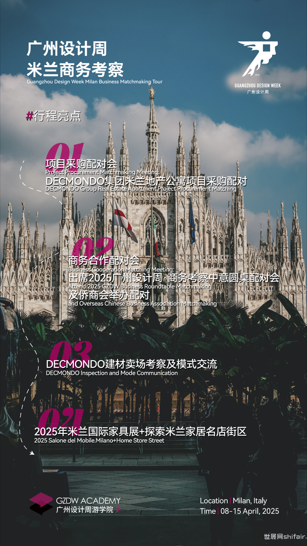 暮春四月,广州设计周联合米兰国际HOAA集团House of Arts and Artists重磅推出2025米兰商务考察之行!将以8天5夜的高效行程,走近米兰家居市场,寻求发展机遇潜力。 项目采购配对会:DECMONDO集团米兰地产公寓项目Via Gallarate 48米兰地产公寓地处米兰市中心附近的Certosa地区,是米兰典型的住宅区,地理位置优越。考察团成员将有机接触DECMONDO集团发布的16+米兰地产公寓项目,锁定2025出海合作商机! 商务合作配对会:2025广州设计周商务考察中意圆桌配对会及侨商会举办派对组委会特别组织2025广州设计周商务考察中意圆桌配对会及侨商会举办派对,邀请建筑室内设计师、海外买家、品牌服务商,及相约前往米兰设计周的中国设计师、家居行业从业者代表进行精准配对交流,链接合作机会与资源! DECMONDO建材卖场考察及模式交流DECMONDO集团家居建材卖场分布于意大利米兰及佛罗伦萨,拥有超1万平方的仓储展厅面积以及超300家意大利品牌工厂供应体系。通过细致卖场考察及合作模式沟通,助力国内家居品牌入驻展厅,落地米兰! 2025年米兰国际家具展+探索米兰家居名店街区同期将前往2025年米兰国际家具展及当地家居名店街区进行市场考察,熟悉米兰人民家居产品偏好及市场概况,捕捉全球第一线设计趋势及行业风向!名额有限 马上报名:https:///forms/AFwANQd6AAgAAcAEwZUABclBJbydSQRLf