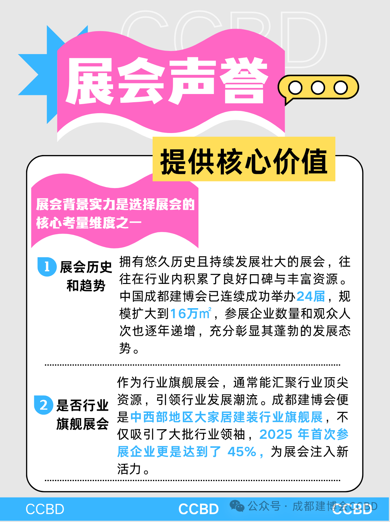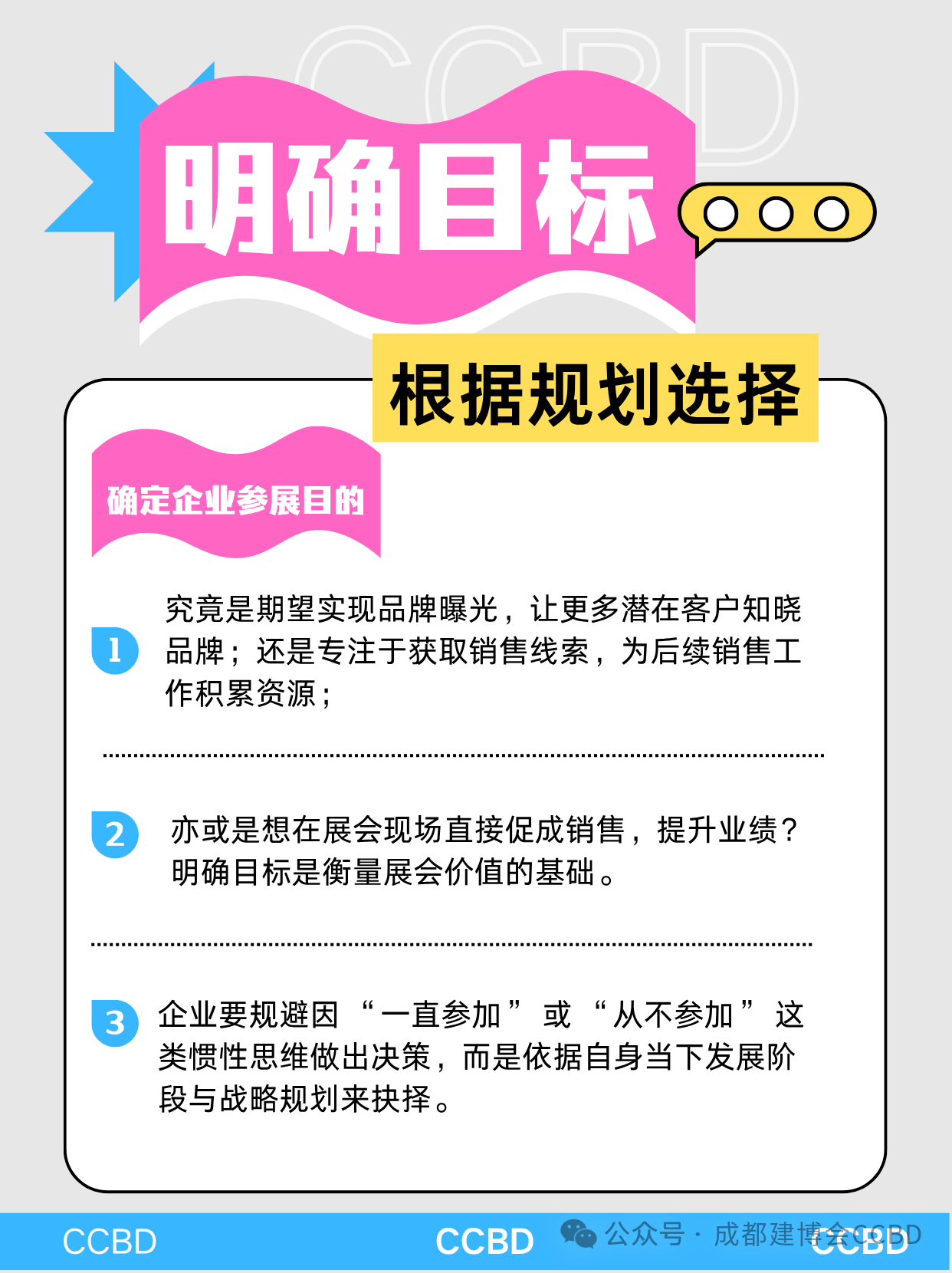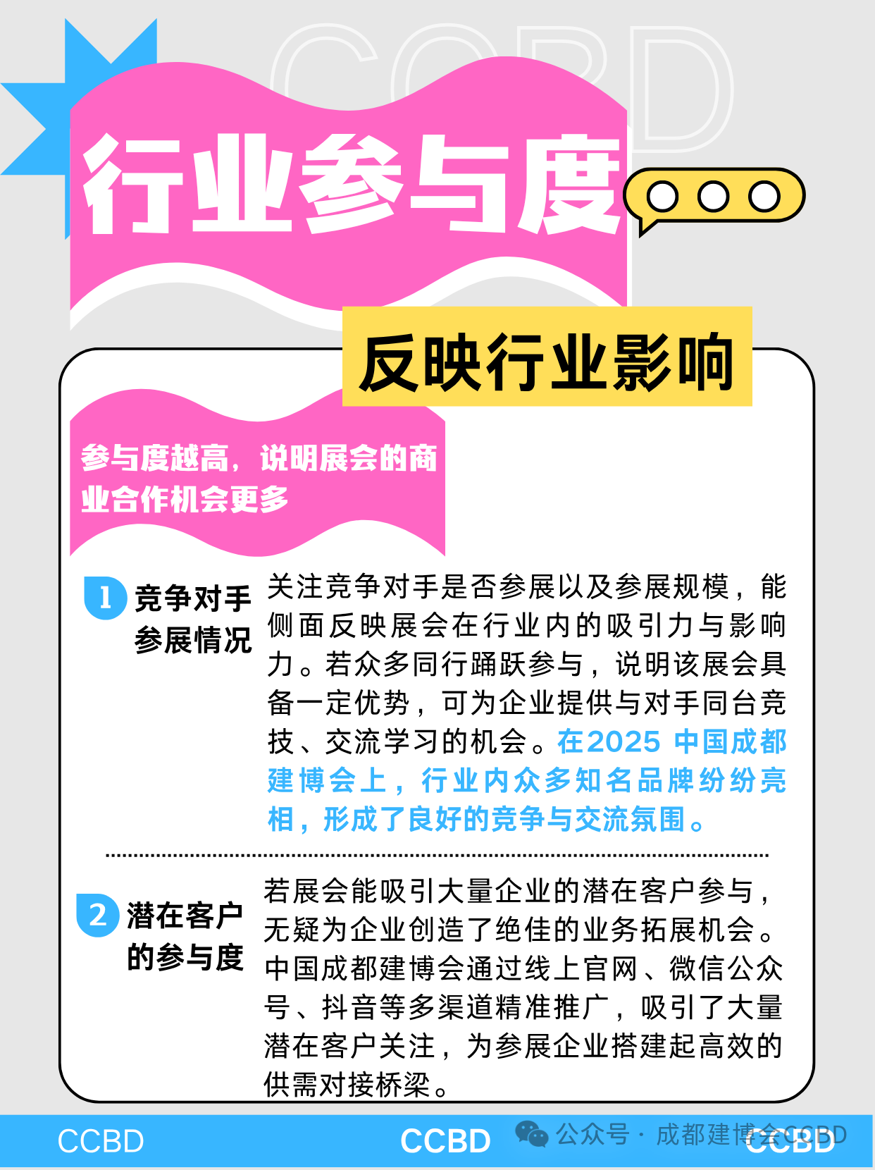 现在市场竞争激烈,企业想要参展拓宽市场,怎么样判断一个展会是否值得参加呢?专业的会展公司教你用五点判断,可以避开80%的坑!1明确目标确定企业参展目的(品牌曝光/获取销售线索/直接销售)避免仅因\x26quot;一直参加\x26quot;或\x26quot;从不参加\x26quot;的惯性决策2展会数据观众数量-总参观人次观众质量-了解目标观众和重要访客的出席情况-评估专业观众比例行业相关性-展会是否针对您的目标行业-专业观众是否决策者居多-是否有严格的观众审核机制*展会的官网数据及展后报告具有一定的参考性哦~3行业参与度了解竞争对手的参展情况考察潜在客户的参与度4展会声誉与规模查看展会历史和发展趋势了解展会是否为行业旗舰展会考察主办方的办展能力及是否具有专业团队5长期价值是否符合企业品牌定位线上曝光和媒体提及行业影响力提升总的来说展会效果评估=短期+长期目标我们在选择 要参与的展会时,不仅要关注即时的交易和销售线索,还要考虑展会带来的长期商业价值。 第二十五届中国(成都)建筑及装饰材料博览会 时间:2026年4月16-18日 地点:中国西部国际博览城咨询参展请点击图中二维码明年春天我们不见不散!