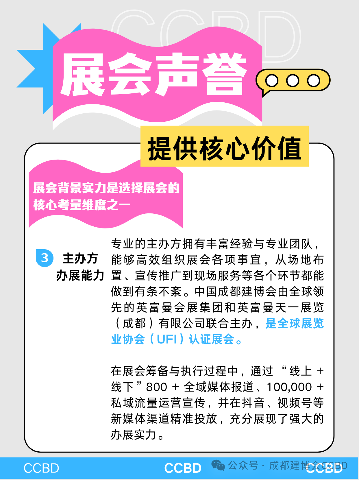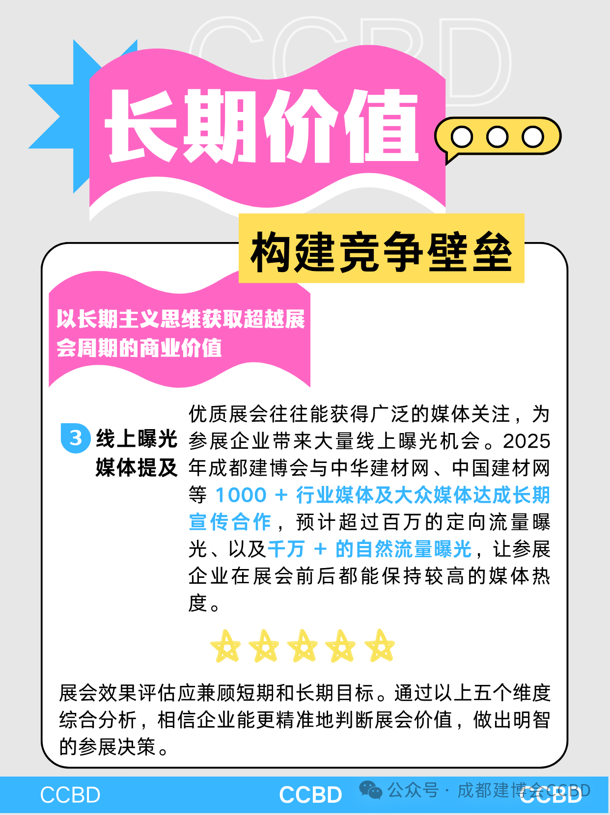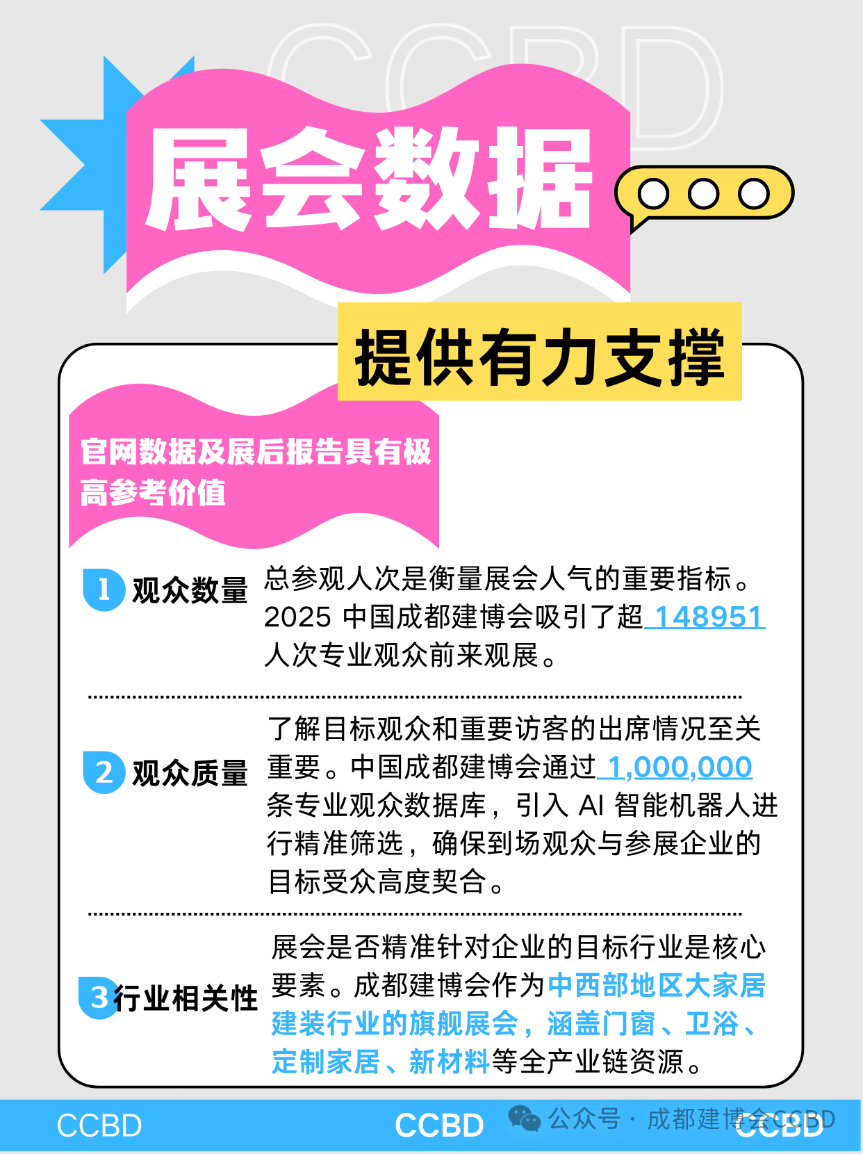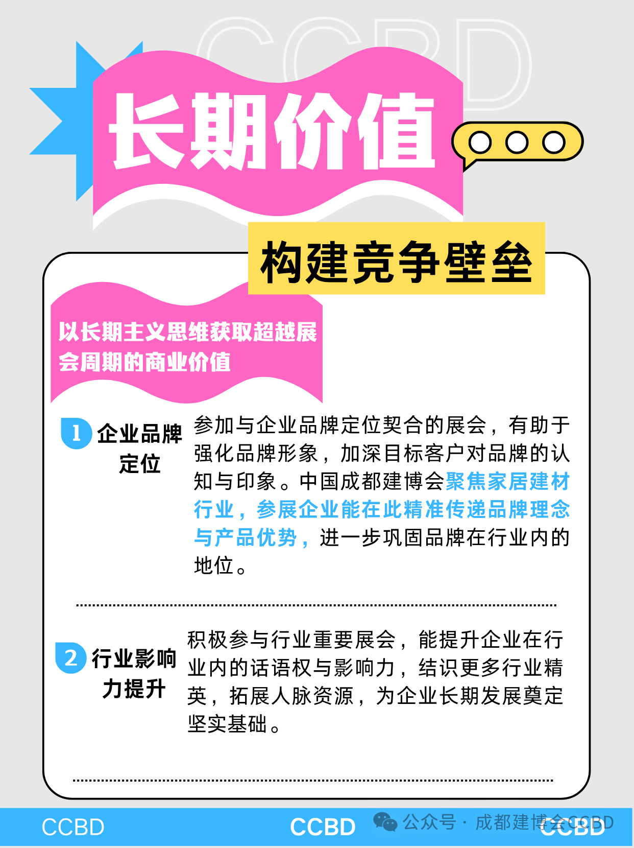 现在市场竞争激烈,企业想要参展拓宽市场,怎么样判断一个展会是否值得参加呢?专业的会展公司教你用五点判断,可以避开80%的坑!1明确目标确定企业参展目的(品牌曝光/获取销售线索/直接销售)避免仅因\x26quot;一直参加\x26quot;或\x26quot;从不参加\x26quot;的惯性决策2展会数据观众数量-总参观人次观众质量-了解目标观众和重要访客的出席情况-评估专业观众比例行业相关性-展会是否针对您的目标行业-专业观众是否决策者居多-是否有严格的观众审核机制*展会的官网数据及展后报告具有一定的参考性哦~3行业参与度了解竞争对手的参展情况考察潜在客户的参与度4展会声誉与规模查看展会历史和发展趋势了解展会是否为行业旗舰展会考察主办方的办展能力及是否具有专业团队5长期价值是否符合企业品牌定位线上曝光和媒体提及行业影响力提升总的来说展会效果评估=短期+长期目标我们在选择 要参与的展会时,不仅要关注即时的交易和销售线索,还要考虑展会带来的长期商业价值。 第二十五届中国(成都)建筑及装饰材料博览会 时间:2026年4月16-18日 地点:中国西部国际博览城咨询参展请点击图中二维码明年春天我们不见不散!