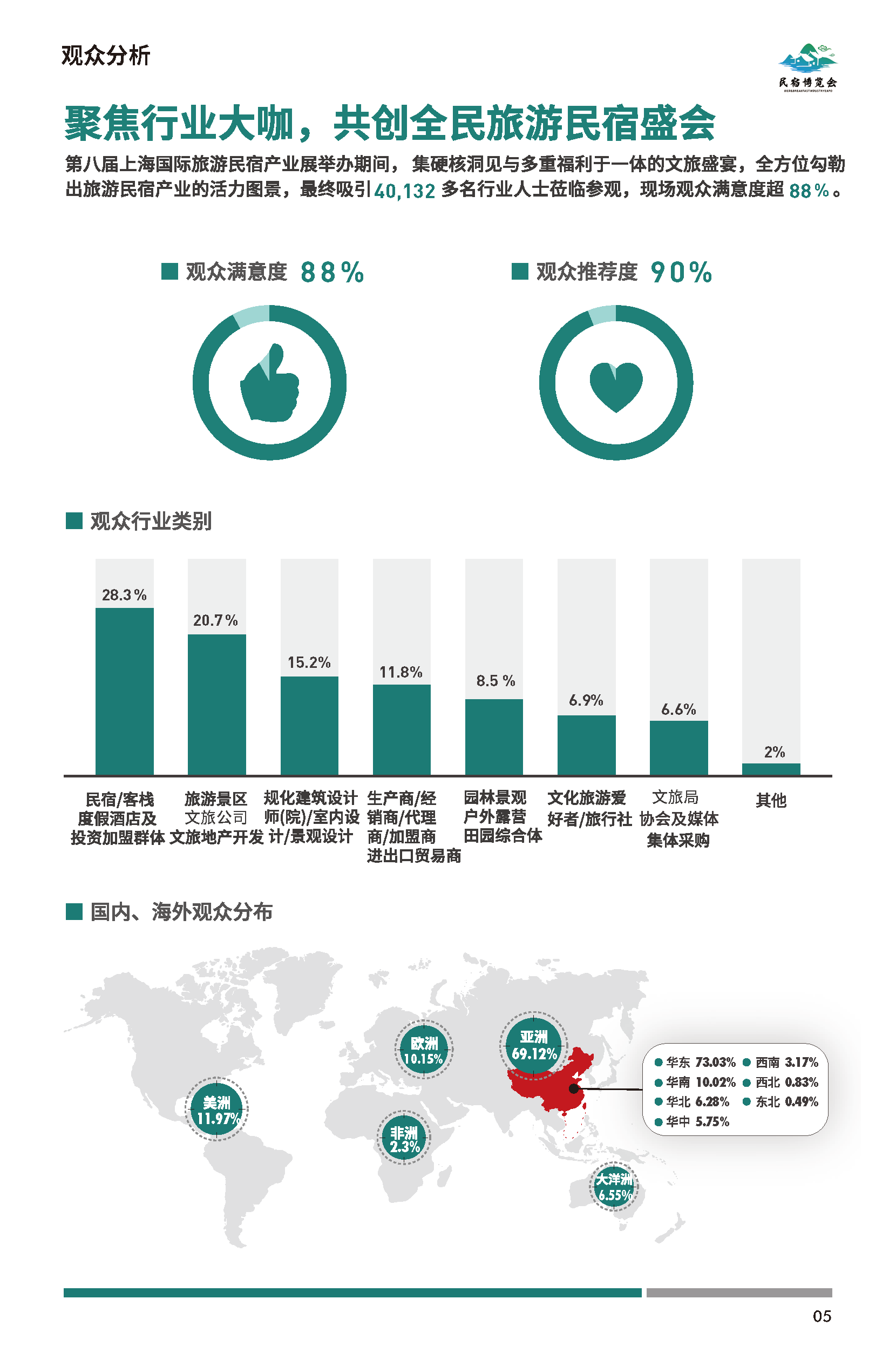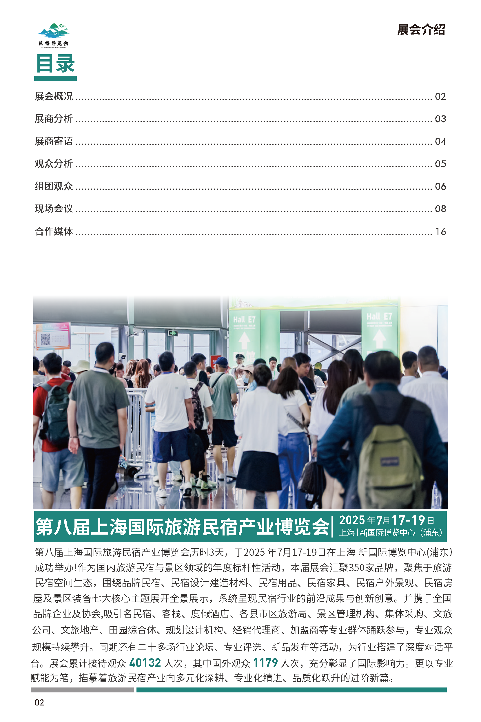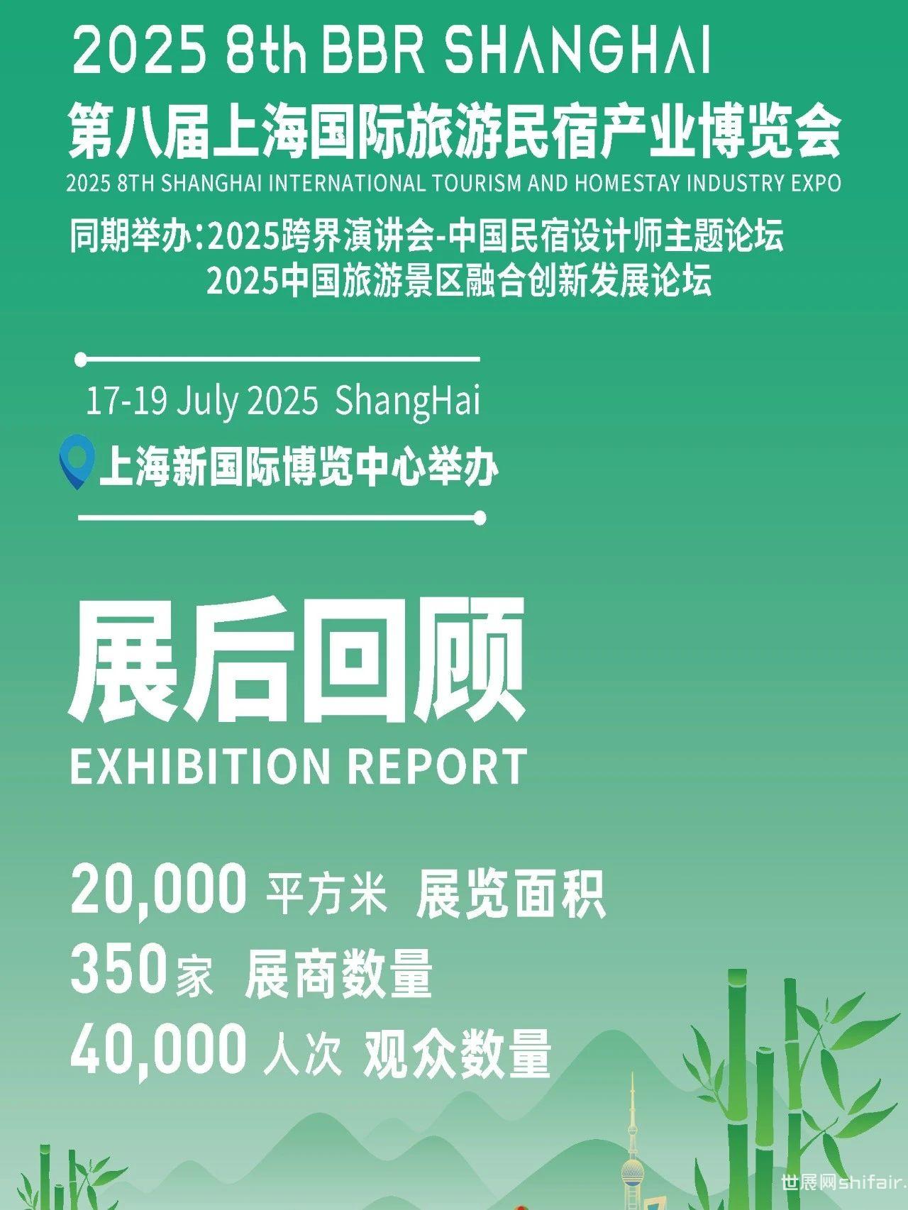 2025 BBR旅游民宿展|展后报告一览具体信息请查看上方图片一、展会基本概况2025上海国际旅游民宿展,本届展会 汇聚350家品牌,聚焦于旅游民宿空间生态,围绕民宿设计建造、民宿用品、民宿家具、房屋及景区装备七大核心主题展开全景展示,系统呈现民宿行业的前沿成果与创新创意。同期还有二十多场行业论坛、专业评选、新品发布等活动,为行业搭建了深度对话。二、展商&品牌维度\x26nbsp;(一)展商分析以巩固老买家、建立品牌形象、推新品、寻新买家为主。\x26nbsp;(二)展商寄语众多展商借展会发力,实现品牌推广、业务拓展,收获颇丰。\x26nbsp;三、观众分析集硬核洞见与多重福利于一体的文旅盛宴,全方位勾勒出旅游民宿产业的活力图景,最终吸引40,132 多名行业人士莅临参观,现场观众满意度超 77%\x26nbsp;(一)买家观众构成与目的买家类别多元,民宿/客栈/文旅投资占28.3%、旅游景区/文旅公司/地产占28.3%,规化建筑设计师(院)/景观/室内设计占15.7%;新买家占比59.6%;买家参展目的主要为找新合作商(49.7%)、与现有合作商会面(44.7%)等。(二)买家积极反馈买家评价展会体验感大幅提升、新品丰富,选品范围拓宽,还通过直播等形式打破时空限制,让消费者参与,感受行业活力。\x26nbsp;(三)组团观众全国各地旅游协会及民宿协会组团参观,参会,共绘旅居生活新图景。四、活动与会议维度\x26nbsp;(一)趋势与对接活动举办20+新趋势会议及活动,聚焦新品与新锐品牌。打造全球新品首发阵地,呈现千款新品,共享洞察和经验,传播思想之声。多形式对接会助力高效对接,300位大买家,线上小程序也促成大量匹配。\x26nbsp;(二)专业交流会议汇聚240+专家大咖,开展30+内容话题交流;2025 宿见中国跨界演讲会、设计师大会、景区大会等细分主题会议。\x26nbsp;五、合作媒体\x26nbsp;(一)媒体宣传本届旅游民宿展以小程序为技术基座,构建 “展前蓄力 — 展中联动” 的线上服务闭环,支持参展商打造专属线上展厅,实现与线下实体展位的协同共振。(二)权威奖项BBR旅游民宿展甄选民宿产业标杆,设品牌优质民宿供应商奖、全域品牌民宿奖等奖项,引领产业新航向。BBR国际旅游民宿展为民宿行业搭建起集展示、交流、交易、学习于一体的生态平台,\x26lt;a data-unique-id=\x26quot;mescpxkf-9m96co\x26quot; target=\x26quot;_blank\x26quot; class=\x26quot;weapp_text_link\x26quot; data-miniprogram-type=\x26quot;text\x26quot; data-miniprogram-appid=\x26quot;wxcdfddc4a1fe805b3\x26quot; data-miniprogram-path=\x26quot;pages/index\x26quot; data-miniprogram-nickname=\x26quot;旅游民宿产业展\x26quot; data-miniprogram-servicetype=\x26quot;0\x26quot; data-miniprogram-applink=\x26quot;\x26quot;\x26gt;点击此处抢占国际旅游民宿展\x26lt;/a\x26gt;