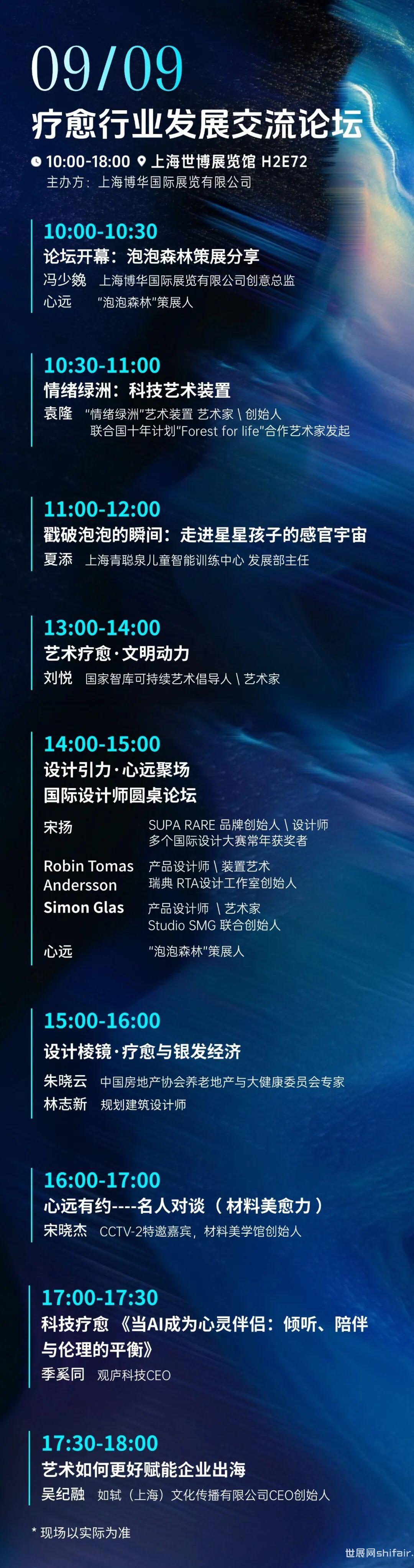 最近压力大、想找个地方放松?「泡泡森林——沉浸式疗愈艺术情绪剧场」太适合你了!策展人心远老师用“泡泡”隐喻现代人被压抑的本真情绪,用“森林”象征自然疗愈力量,超现实的空间设计让人仿佛走进了避世的理想国。在这里深呼吸、感受灯光和音乐带来的五感刺激,能帮你暂时剥离工作、生活的压力,找回纯粹的自己,逛累了来这里歇一歇,简直是身心双重放松。9月9-11日,「泡泡森林——沉浸式疗愈艺术情绪剧场」还将举办一系列疗愈行业发展交流论坛。