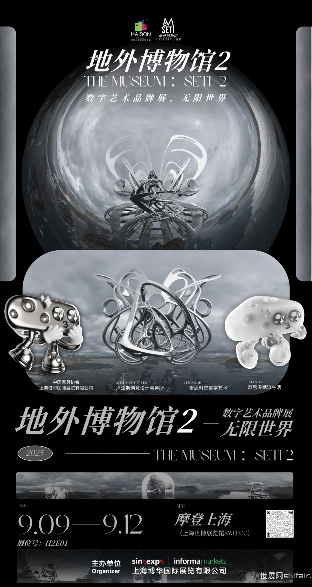 「地外博物馆 SETI 2.0」由Ruphus史佳弢、卜天静联合策展,联袂荣泰、ALTIST、斯博瑞、喜临门、超亚家具、优伦、MEWORK FURNITURE、英杰科技、众邦家居9大家具品牌,通过未来感十足的视频手法,打造首个未来主题的数字艺术品牌展,带领观众在沉浸式光影宇宙体验中穿梭于奇幻的无限世界,并通过CHEEStore IP商店把灵感与纪念品带回家。