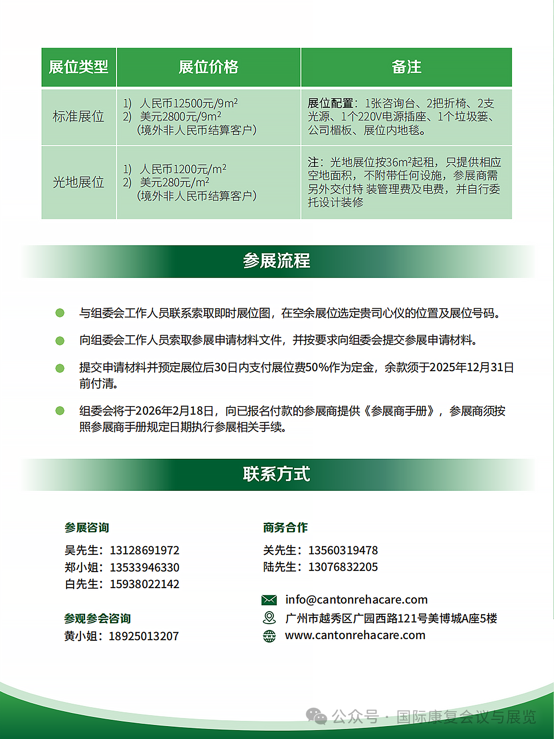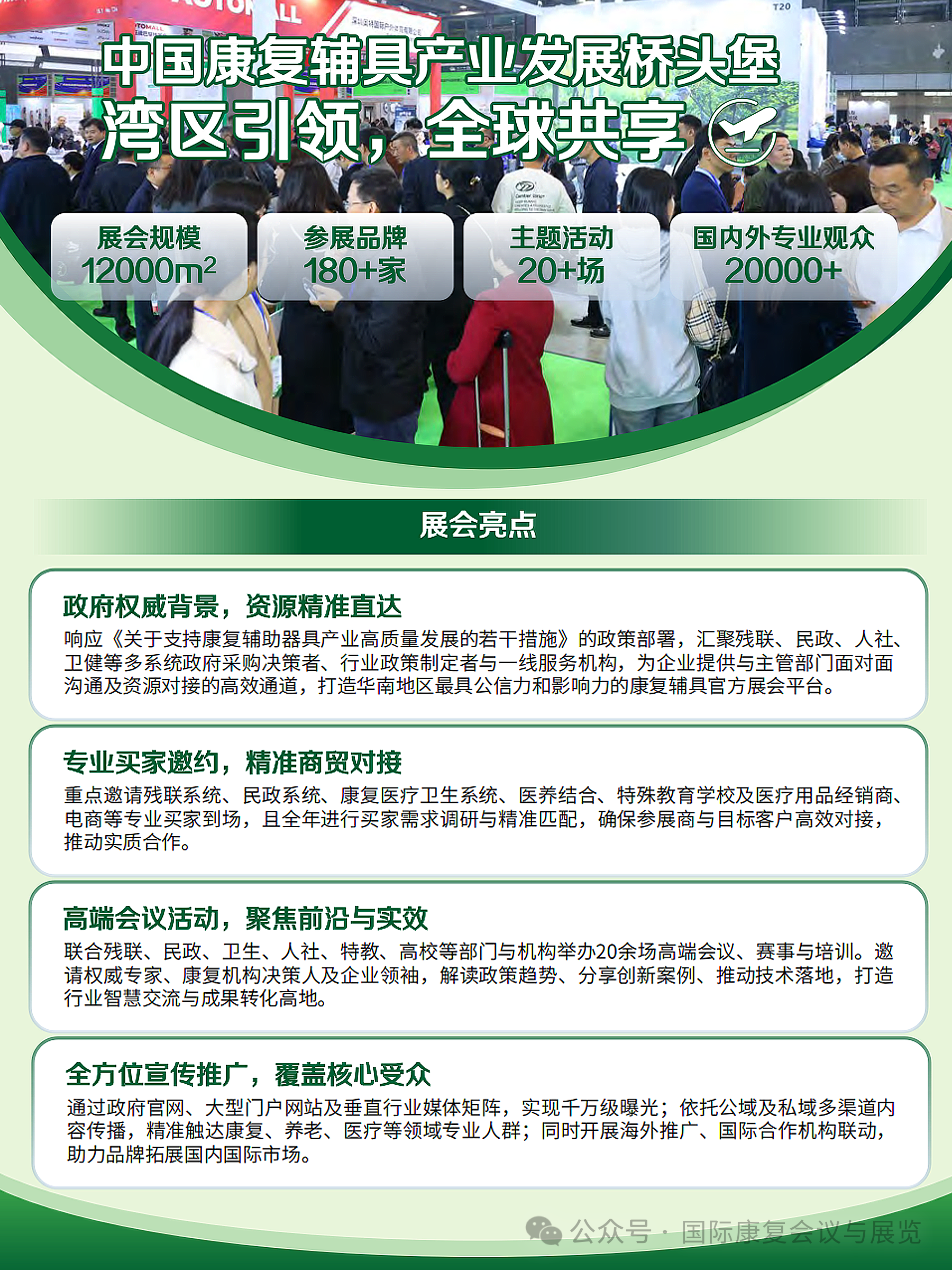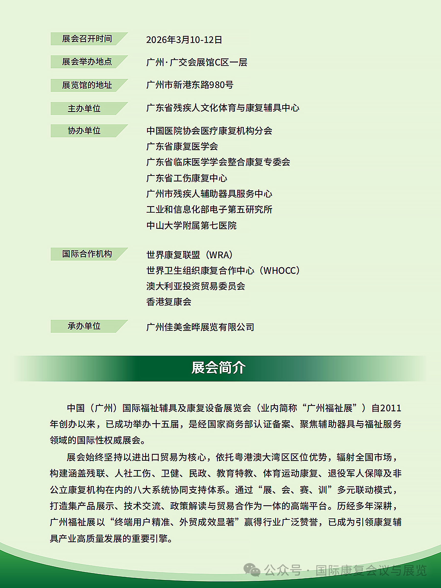2026 中国(广州)国际家用医疗康复护理及福祉辅具展览会,将于2026 年 3 月 10 - 12 日在广州广交会展馆 C 区一层盛大举办!作为经国家商务部认证、创办超 10 年的权威性展会,已成功举办十五届,是康复辅具与福祉服务领域的标杆盛会。展会核心优势,为参展保驾护航 区位和规模优势:展会将在广州广交会展馆举办,展会规模达 12000㎡,汇聚 180 + 参展品牌,规划康复医疗器械、行动辅具、无障碍设施等八大产品展区。 精准资源对接:响应国家政策,联动残联、民政、人社、卫健等多系统资源,打造华南最具公信力的行业平台;全年开展专业买家需求调研,重点邀请残联、康复医疗、特教机构等领域买家,实现 “展商 — 目标客户” 高效商贸对接。 高端活动赋能:举办20 + 场主题活动,包括全国康复机构院长大会、脊髓损伤出行带头人大会、孤独症康复教育研讨会等,邀请权威专家、企业领袖解读政策趋势、分享创新案例,助力展商把握行业前沿。 全域宣传曝光:通过政府官网、主流媒体矩阵、海外合作机构等多渠道,实现千万级曝光;同步开展海外推广,精准触达全球康复领域专业人群,助力品牌拓展国内外市场。参展能获得什么? 展示产品与技术,抢占康复辅具行业风口; 对接残联、民政、国际买家等多类专业买家,挖掘海内外订单; 参与高端会议,获取行业前沿资讯,搭建优质社交网络; 借助千万级宣传矩阵,提升品牌知名度与行业影响力。诚邀您加入这场康复辅具行业盛会,共拓市场、共赢未来! 展会官网: