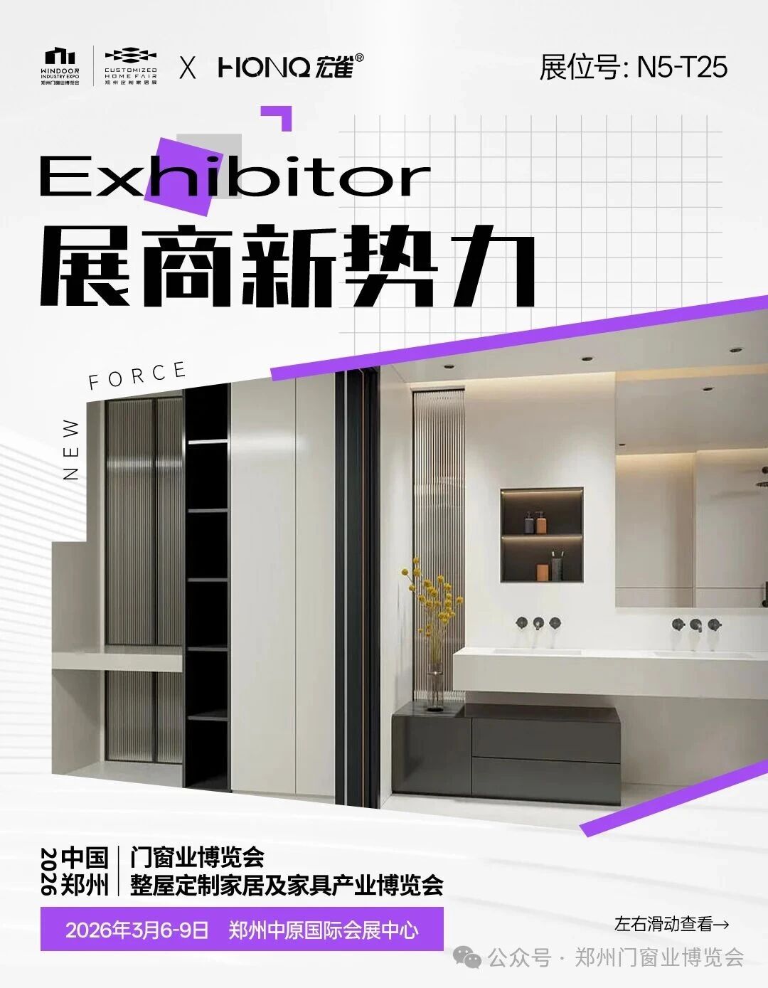 移师航空港,盛启新征程!宏雀门窗,邀您相聚 2026 郑州门窗业暨整屋定制家居展,品味经典风格,缔造永恒家居美学!参展品牌:宏雀门窗展位号:N5-T25展览时间:2026 年 3 月 6-9 日展览地点:郑州中原国际会展中心(航空港区)宏雀深耕门窗领域数载,以 “专注品质,引领潮流” 为理念,赢得市场广泛认可。主要经营完美系统 - 推拉门 / 平开门,50 系统 - 推拉门 / 平开门等产品,全方位满足不同家庭及商业空间的多样化需求。2026 年3 月6-9 日,宏雀门窗将携系列新品亮相现场,邀您共赴郑州中原国际会展中心N5-T25,不见不散!