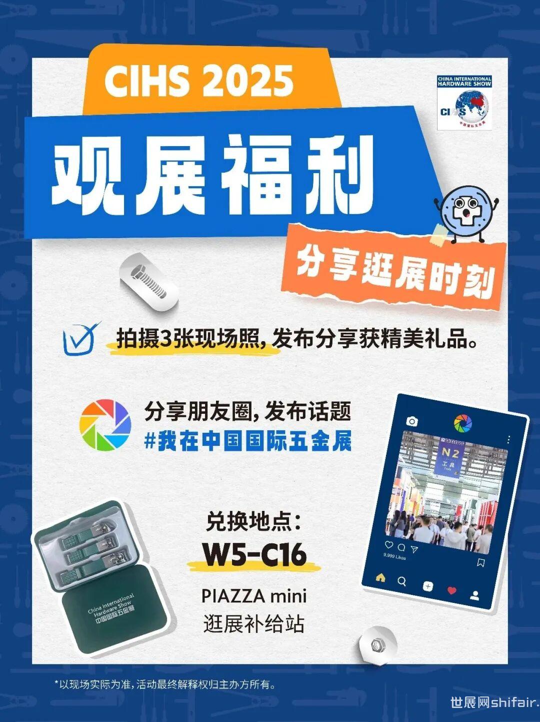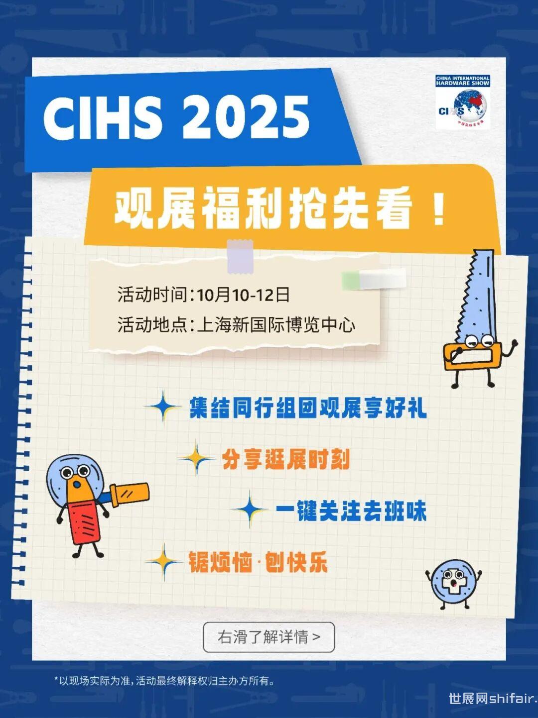 第二十二届中国国际五金展 —— 五金行业的年度盛会,即将在上海拉开帷幕! 日期:2025年10月10-12日 地点:上海新国际博览中心为提升您的观展体验,观展福利享不停! 观展福利——集结同行,组团观展享好礼5人即可成团,与同事/朋友一起享团体观众尊享礼包! 观展福利——分享逛展时刻现场与官方互动,领取好礼! 观展福利——一键关注去班味让元气咖啡挥去一天的疲惫! 观展福利——锯烦恼 · 刨快乐打开改造之窗,点燃创作之魂!分享你的灵感赢取精美礼品! 更多观展福利等你现场解锁!金秋十月 · 上海浦东,与您相约!