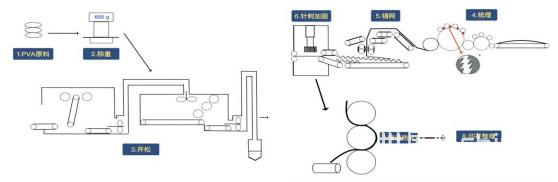 工艺路线为:PVA纤维→开松混合→梳理成网→交叉铺网→针刺加固→常温热轧轧光处理→印花整理。产品一为 40℃PVA 针刺非织造布;产品二为 90℃PVA 针刺非织造布。其中PVA纤维不仅具有理想的水溶温度和强伸度,还有良好的耐酸碱、耐干热性能,而且溶于水后无味无毒,水溶液呈无色透明状,在较短温度内能自然分解,对环境不产生任何影响,是百分百的绿色环保产品。经实验检测,发现产品具备可溶解、干湿态断裂强度大、耐磨性好、柔软度好,透气性好等优点。2. 设备:本实验所采用到的设备,可根据非织造厂已有设备自行组装,包括:开松混合、梳理机、铺网机、针刺机和热轧机。作品解读1. 创新维度紧扣大赛“创新与可持续”主题,本作品在原料、工艺及应用场景层面实现三维创新:(1)原料创新:选用 90℃与40℃聚乙烯醇(PVA)水溶性纤维,其可控溶解性与生物降解特性,拓宽传统非织造材料的应用场景,为可循环提供原料基础。(2)工艺创新:通过纤维开松、梳理成网、针刺加固与常温热轧粘合多工序协同,结合可视化印花技术,实现功能与外观一体化设计,赋予产品遇水溶解、干湿态高强度的独特性能。(3)应用场景创新:将非织造材料创新性拓展至核废料无害化处理等特殊领域——实现低浓度放射性污染物的可控吸附与溶解分离,同时在文物保护中突破传统擦拭材料的残留限制,在电池电解液回收中实现介质高效分离,借助跨领域应用创新,实现非织造材料从常规场景向高危、精密场景的技术跨越。2. 可持续维度聚乙烯醇(PVA)水溶性纤维天然可降解,遇水完全分解无残留,从源头践行绿色理念,应用端通过多场景实现可持续发展:- 文物修复中零污染清洁、电池产业电解液循环利用,减少资源浪费;