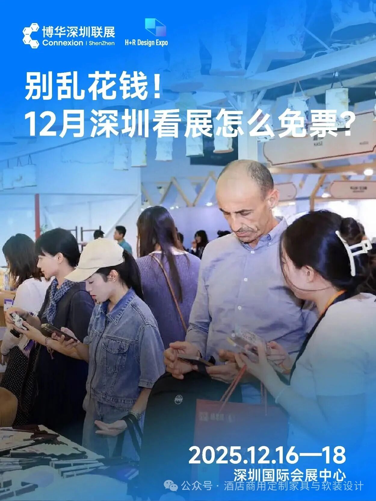 设计师、酒店民宿主理人、跨境电商老板,或者只是想给家或商业空间找灵感的你,这个展绝对不能错过!免费领票,邀您共赴深圳国际酒店家具展1 规模超大,一站式看全! 20万㎡ 展示面积,2500+ 家优质展商 从酒店家具、软装到花园户外家具 从装饰材料、灯饰到跨境电商家居全都有不用东奔西跑,一天之内打通上下游供应链,采购效率拉满!免费领票,邀您共赴深圳国际酒店家具展2 精准匹配你的需求! 如果你是酒店/餐厅/商业空间业主:这里就是你的沉浸式选材库!前沿家具、软装和材料,直接对接源头工厂,搞定设计和采购。 如果你是跨境电商从业者:专门打造的跨境电商家居采购平台!依托深圳产业带优势,轻松找到能“工厂直采”的优质供应链,解决选品难题。 如果你是设计师/设计爱好者:快来吸收灵感!50+场行业论坛,汇聚顶尖大咖,带你洞悉最新酒店、商空设计趋势和可持续设计理念。免费领票,邀您共赴深圳国际酒店家具展3 50+趋势论坛,听大佬分享!展会同期论坛质量超高,主题覆盖: 家居跨境出海新蓝海 商业空间的可持续设计 设计引领集采新思维 2025.12.16-18 深圳国际会展中心找设计、找灵感、看趋势、听论坛免费领票,邀您共赴深圳国际酒店家具展