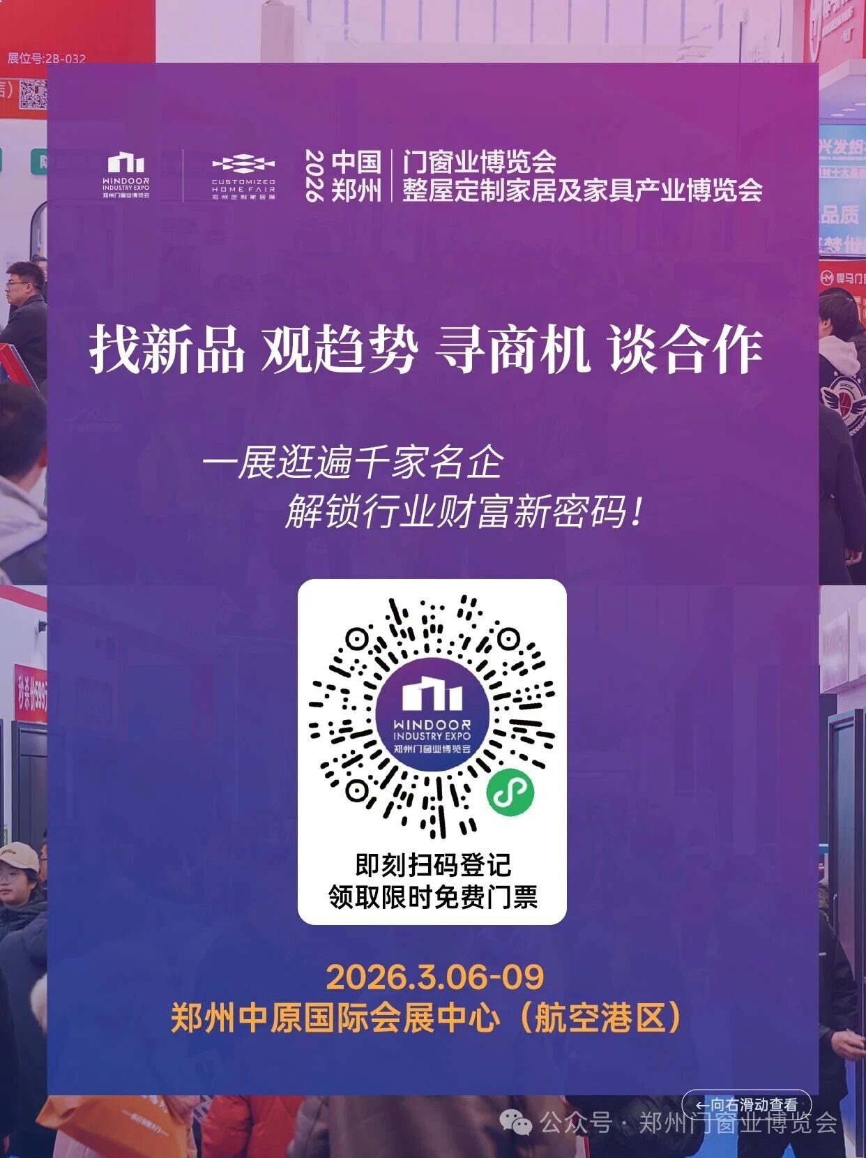 宝子们集合啦!2026家居行业开年首场王炸展会已就位 —— 中国郑州门窗业暨整屋定制家居展,这波直接把行业顶流都凑齐了!时间:2026年3月6日—9日地点:郑州中原国际会展中心(航空港区)排场直接拉满:20万㎡展览面积+3000家品牌集结+15万件新品首发+30万观众齐聚,“2026家居开年第一展” 真不是吹的各展区精准戳中需求门墙柜一体化展区:整装木门/酒柜/墙板一站式看齐,名昊、伯艺、M55木门、北美梧桐、金氏百年、林源、丽朝等品牌颜值实力双在线!金属门展区:防盗门/防火门/五金锁具全覆盖,长城、双诚、嵖岈山、欧诺梵、柱诚、九皇等大牌扎堆秀硬货!系统门窗及移门展区:断桥铝/淋浴房/移门/门窗型材全亮相,美通、美盾、欧派克、安尔堡、班铂、智宏、格茂等实力选手放大招!定制及高定展区:整木定制/高端定制/定制板材全拿捏,千年舟、莫干山、澳思柏恩、水性科天、克诺斯邦、天坛精板、路兹高定带你踩中趋势!智能制造展区:开料机/封边机/六面钻等家居生产设备云集,傲刻、极东、南兴、星辉、迪码等硬核厂商就位!不管你是找新品、探行业风向,还是谈合作拓商机 一趟逛够千家名企,采购效率直接拉满!免费领票!2026家居行业开年第一展观众预登记火热开启!