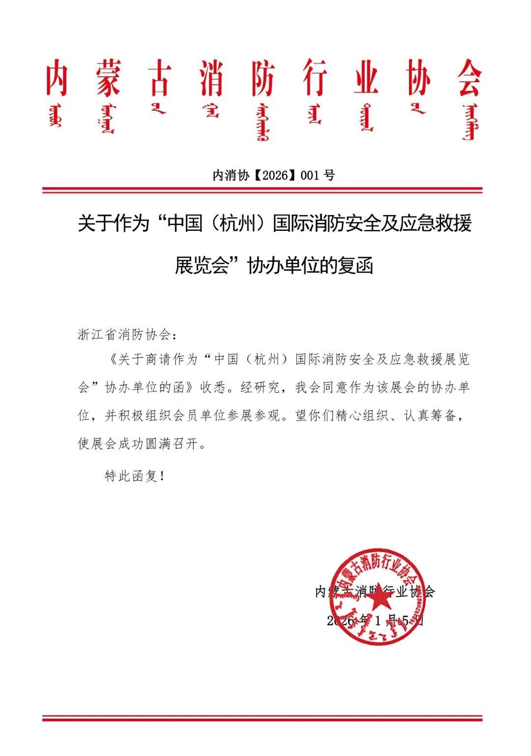 喜讯!内蒙古消防行业协会同意成为“2026中国(杭州)国际消防安全及应急救援展览会”协办单位,将联手推动中国应急消防安全产业高质量发展!届时,将组织会员单位参展参观。