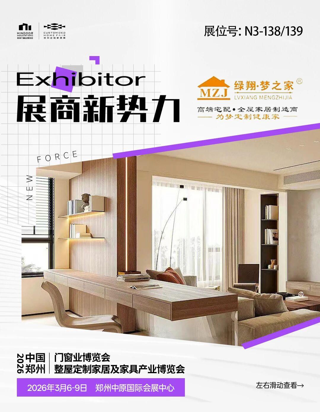 移师航空港,盛启新征程! 作为专注整屋定制领域的实力品牌,深圳梦之家智能家居将携全产业链实力重磅登场2026郑州门窗定制家居展。梦之家以“引领时尚潮流、缔造精品家居”为核心理念,构建了涵盖智能家居产品、门窗、建材、厨卫用品、家具软装等全品类的全屋定制体系。 参展品牌:深圳梦之家智能家居展位号:N3-138/139展览时间:2026年3月6-9日展览地点:郑州中原国际会展中心(航空港区) 梦之家深度诠释“品质与美学共生、智能与环保兼具”的产品核心,依托资深设计团队与前沿研发能力,从门窗、瓷砖到家具软装的一体化定制,从一对一的专属设计服务到严格的数十道质检工序保障,每一处细节都贴合追求品质生活人群的核心诉求,彰显品牌在环保与智能领域的创新实力。 2026年3月6-9日,深圳梦之家智能科技诚邀您相聚郑州中原国际会展中心(航空港区)N3-138/139,直观体验全屋定制场景的适配效果,与资深设计团队面对面沟通,共探全屋定制与智能家居融合的行业新趋势。