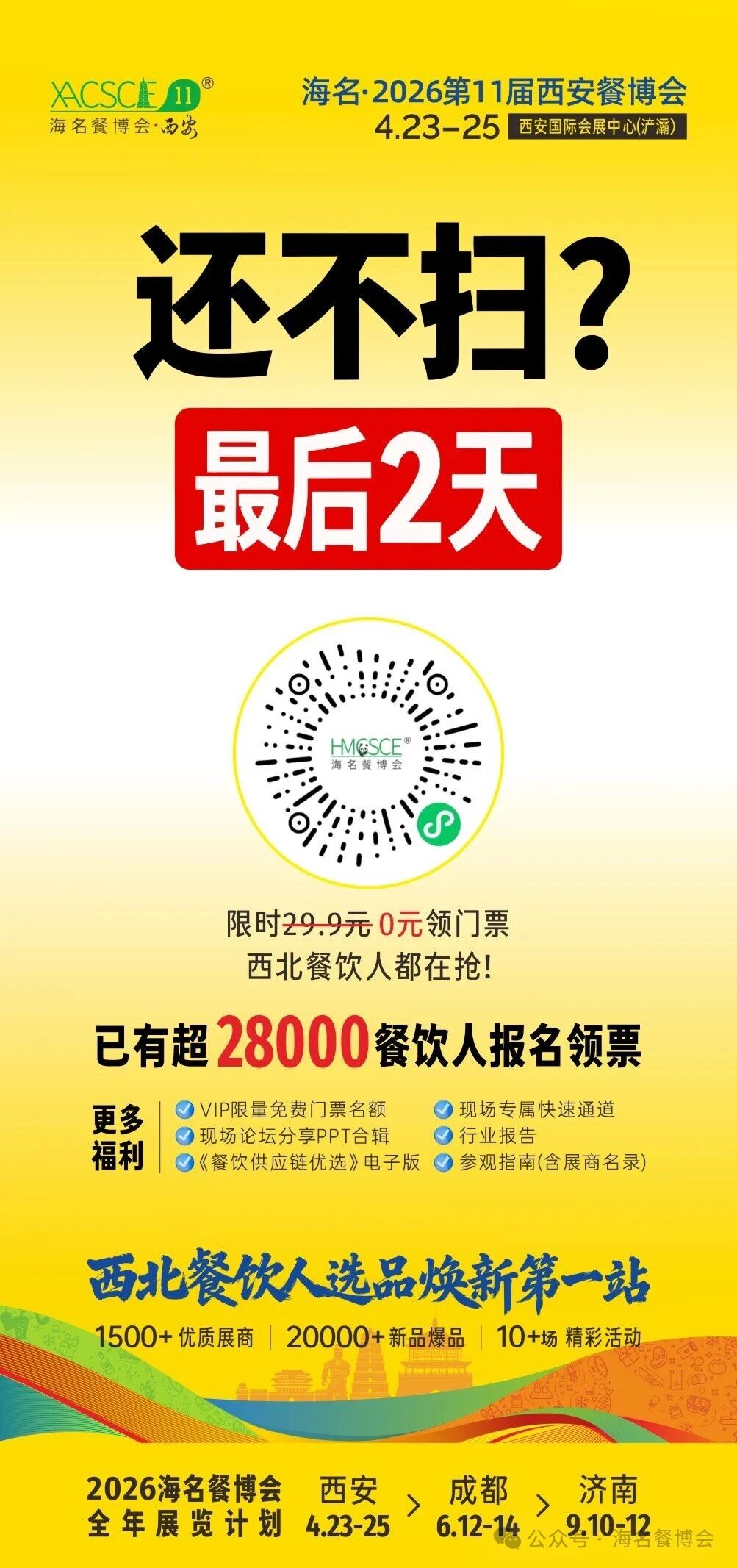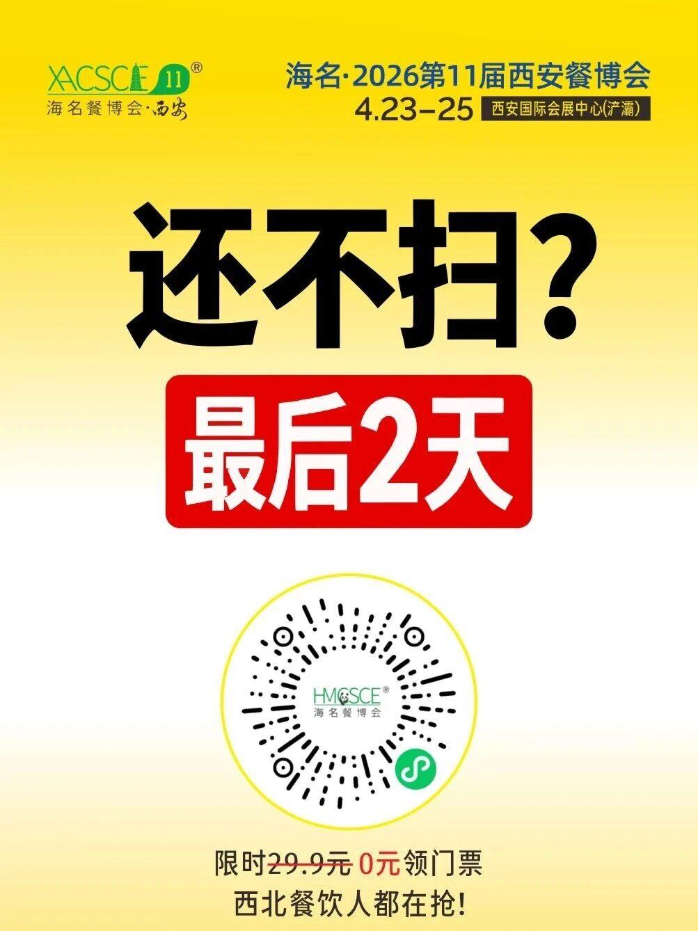 倒计时最后 2 天! 价值 29.9 元的海名·2026第11届西安餐博会门票,现在0元免费领!已有超28000位餐饮同行抢先报名,手慢真的无! 展会信息时间:2026年4月23-25日地点:西安国际会展中心(浐灞)定位:西北餐饮人选品焕新第一站规模:1500+优质展商|20000+新品爆品|10+场精彩活动 0 元领票即享 6 大权益 VIP 限量免费门票名额 现场专属快速通道 现场论坛分享 PPT 合辑 《餐饮供应链优选》电子版 行业报告 参观指南(含展商名录) 转发加码福利转发1次朋友圈:凭截图领精美笔记本1份 +《餐饮供应链优选》电子版连续转发3天:额外领20元美食市集代金券(现场兑换) 立即扫码领票,错过再等一年!#西安餐博会 #西北餐饮 #餐饮供应链 #免费门票