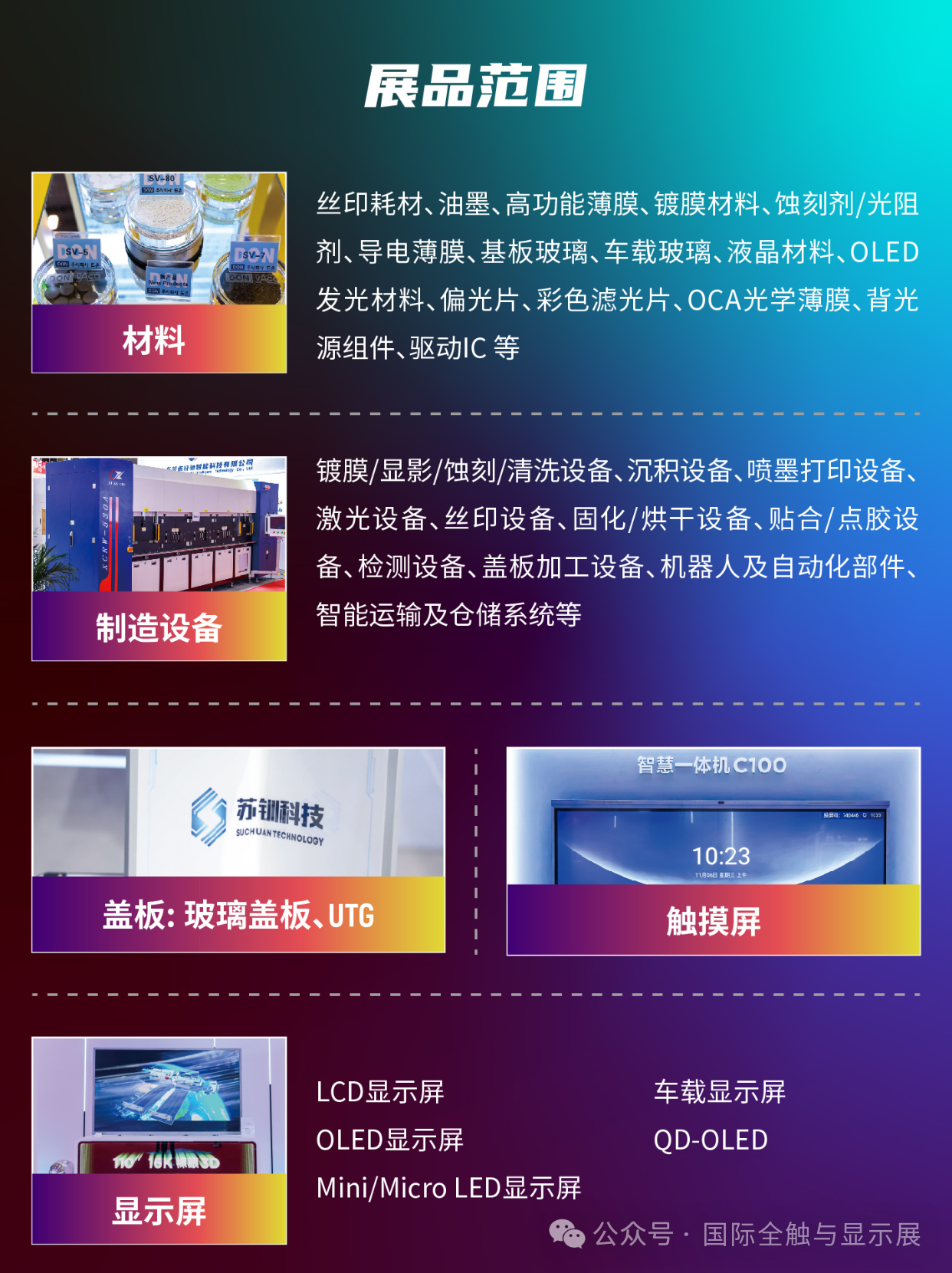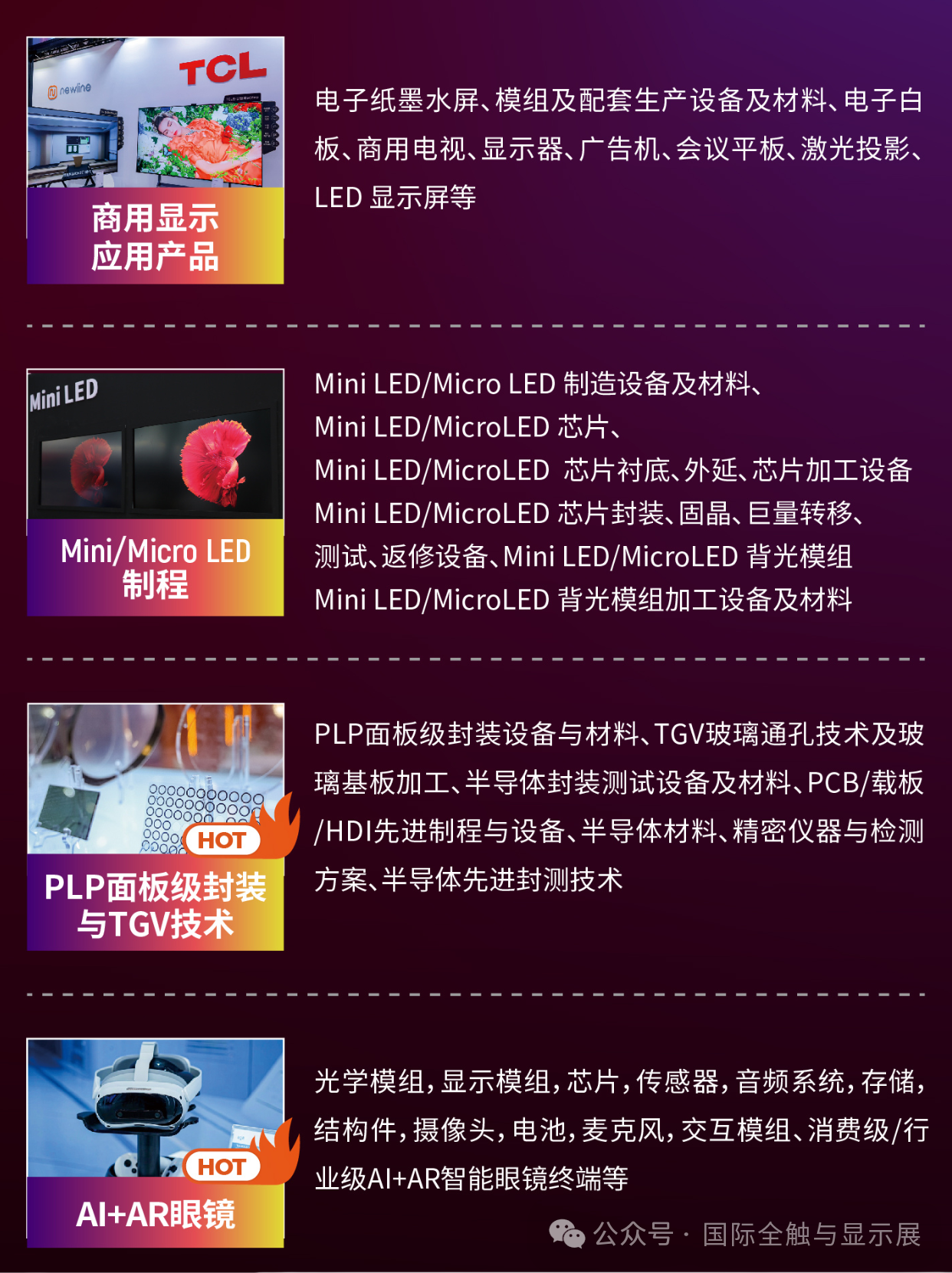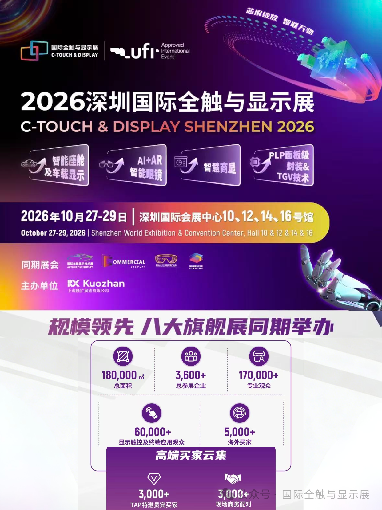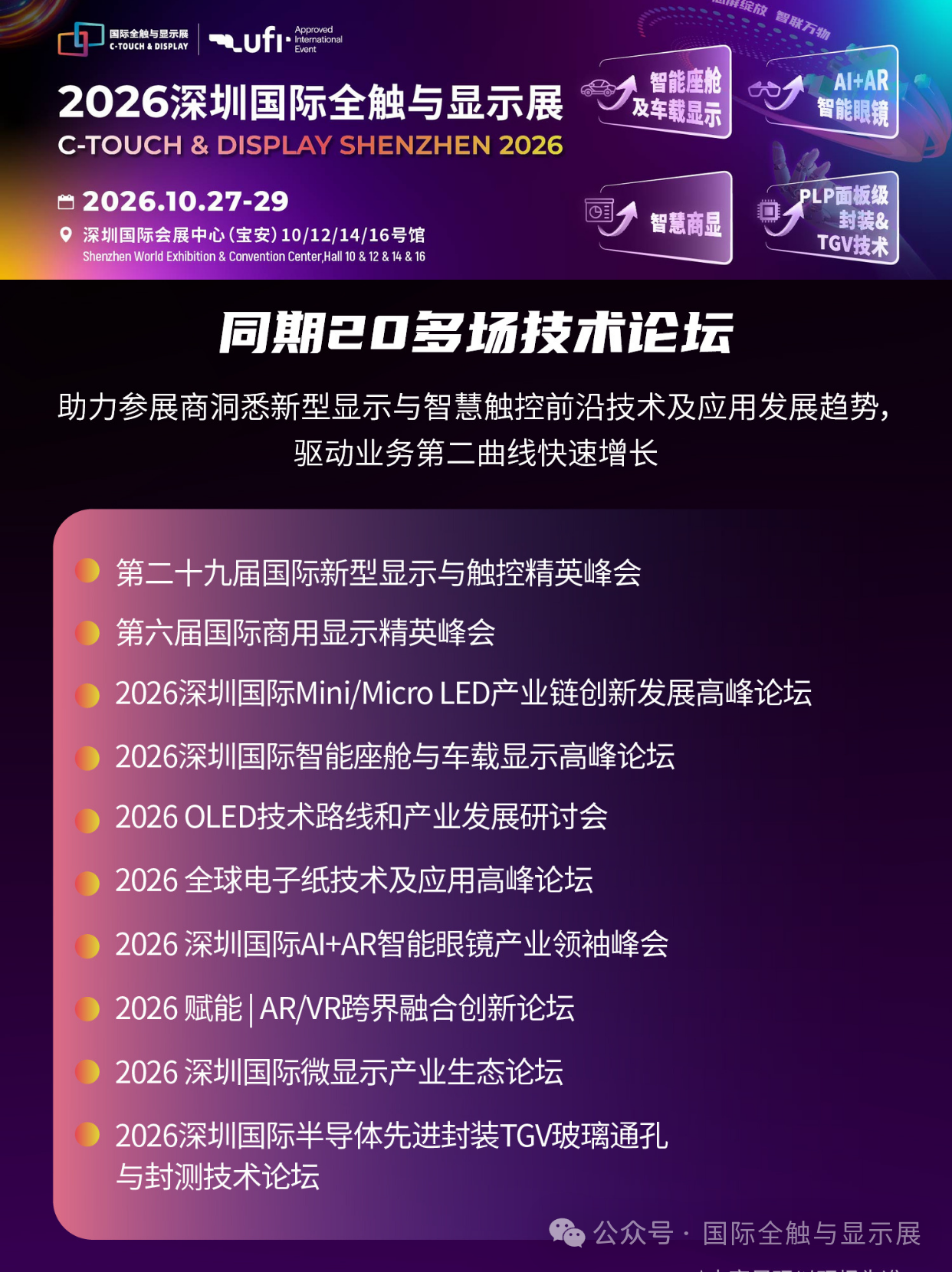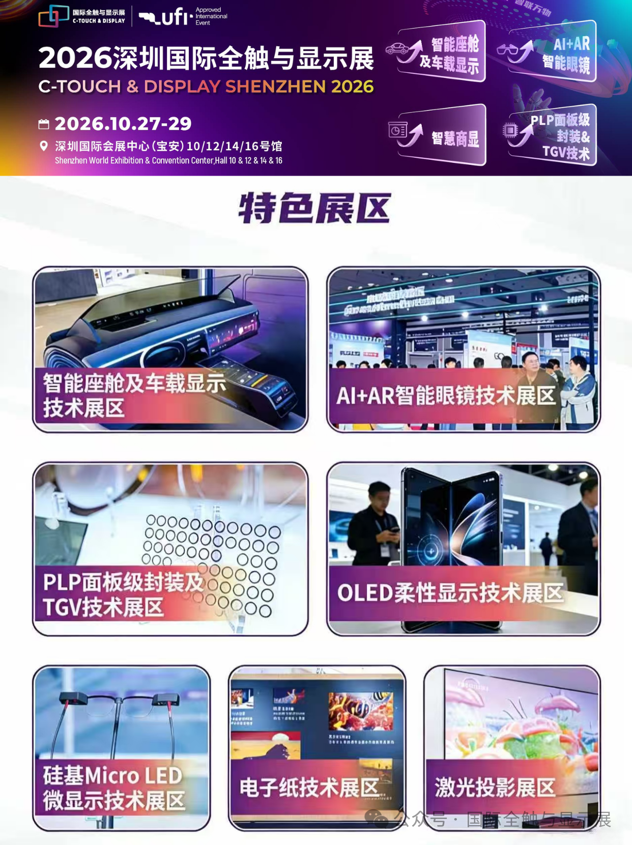 四大核心优势— 产业风口:Micro LED 迎产业化临界点,2026 年市场破 1 亿美元,同比增 100%— 技术前沿:聚焦智能座舱、智慧商显、AI+AR智能眼镜、PLP&TGV 前沿技术— 精准对接:一对一供需配对、闭门技术交流、专场场景对接— 大咖云集:三星、LG、TCL、海信、比亚迪、华为、Meta、XREAL 等头部买家齐聚 重点展示内容— #智能座舱及车载显示:车载 Micro LED、中控屏、AR-HUD、调光玻璃— #智慧商显:数字标牌、交互平板、LED 一体机、透明显示— #AIAR智能眼镜:Micro LED、光波导、光学组件、空间计算方案— #PLP和TGV技术:封装设备、材料、工艺与量产解决方案 高端会议体系—设国际新型显示、车载显示、AI+AR智能眼镜的产业领袖等重磅峰会 — 全球专家直击 Micro LED 巨量转移、良率、成本等核心瓶颈— 发布权威产业白皮书、年度技术评奖、推进产业标准化参展联系:李翔 先生电话:邮件:edison.展会咨询