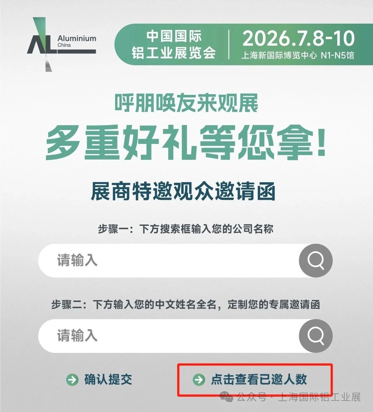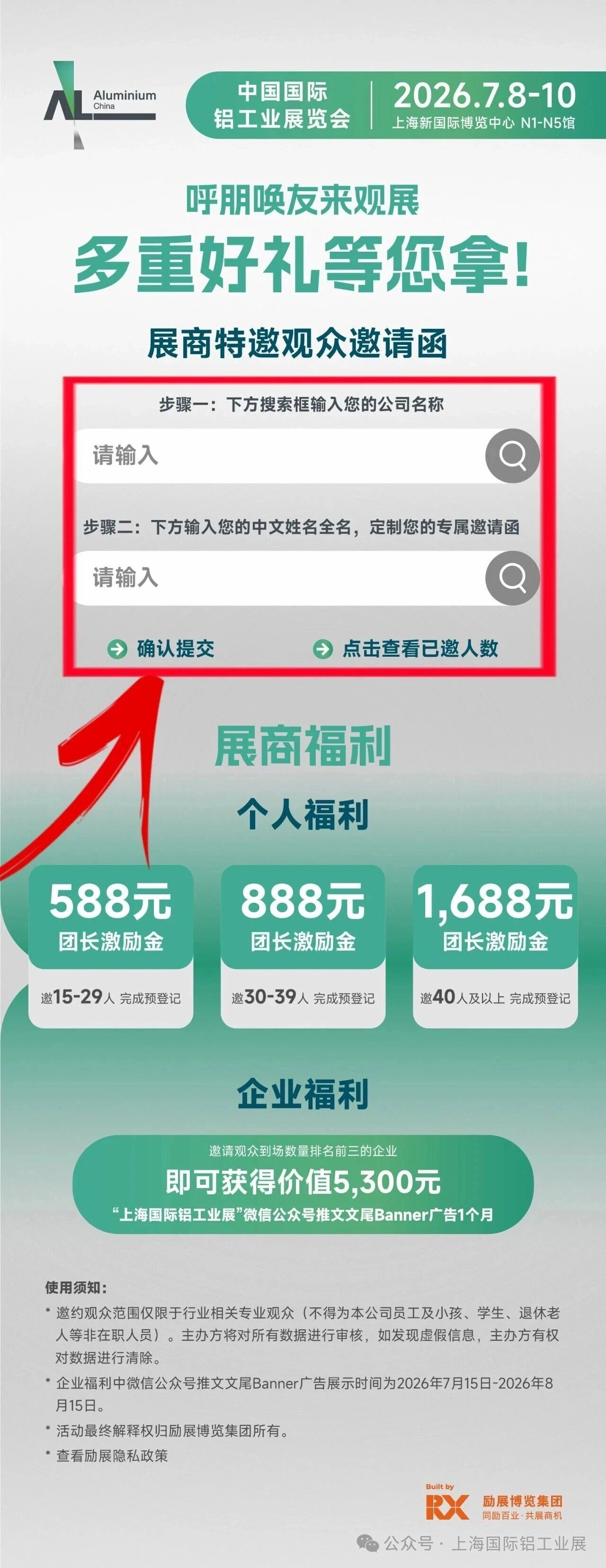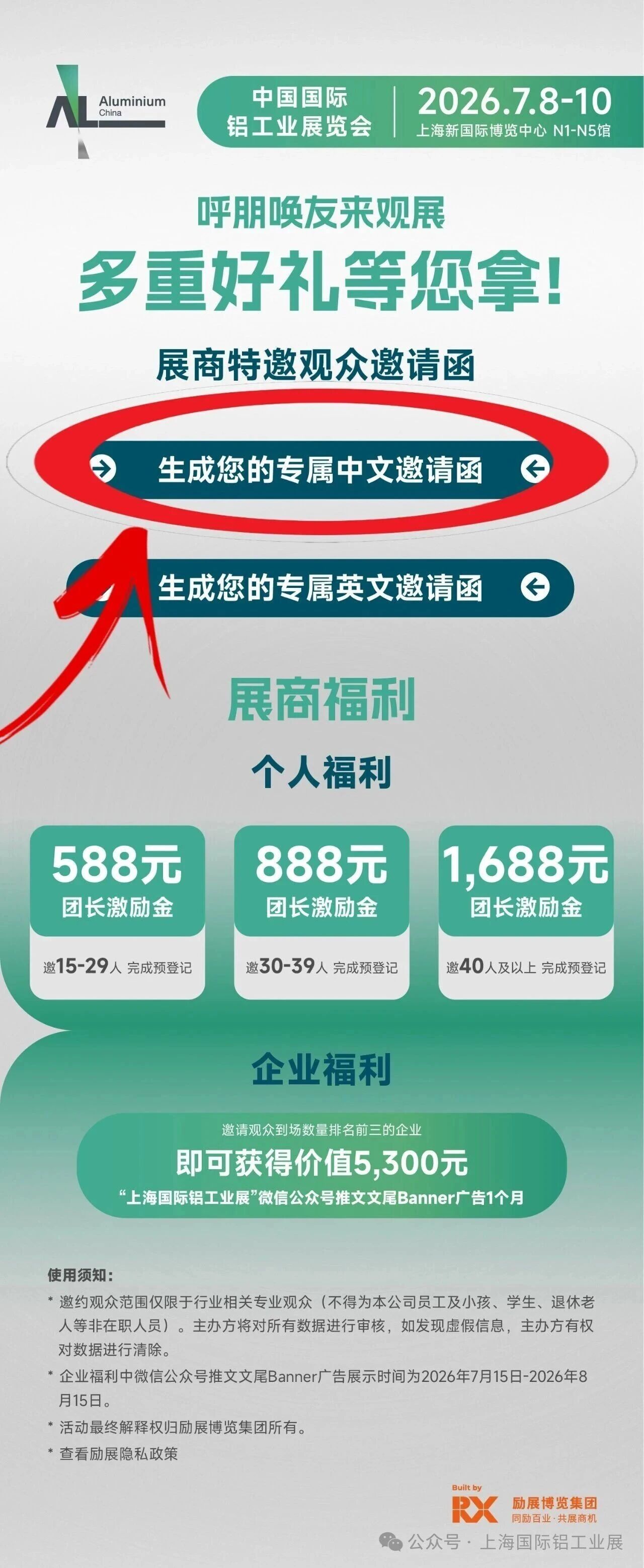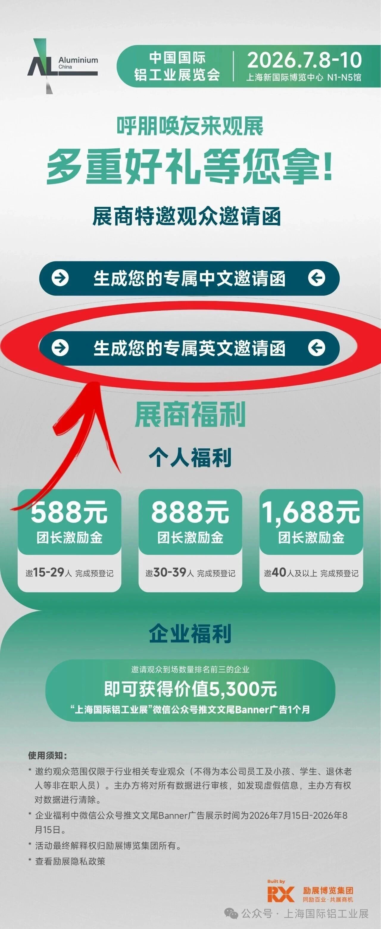 第21届中国国际铝工业展览会即将在沪盛大启幕!主办方特别推出展商专属邀观福利活动,诚邀您邀请海内外行业客户、合作伙伴及潜在买家共赴铝业年度盛会,共拓商机、共享行业发展新机遇! 展商个人福利: 邀请观众完成预登记,即可获得专属奖励:邀请 15–29 人完成预登记团长可获 588元激励金邀请 30–39 人完成预登记团长可获 888元激励金邀请 40 人及以上完成预登记团长可获 1688元激励金 展商企业福利: 邀请到场观众数量排名前三的企业还可额外获得价值 5300元微信公众号推文文尾 Banner 广告位(1个月) 如何定制您的专属邀请函?扫描头图二维码,进入活动页面即可生成专属邀请函: 中文版邀请函生成步骤:1点击“生成您的专属中文邀请函”2填写贵公司中文名称及您的姓名并提交3上传公司 Logo 及展位效果图(如无需替换,请保留默认图片)4通过右上角“...”分享邀请函链接至微信好友、朋友圈或行业社群 英文版邀请函生成步骤(助力高效邀约海外观众):1点击“生成您的专属英文邀请函”2填写贵公司英文名称及您的英文姓名并提交3上传公司 Logo 及展位效果图(如无需替换,请保留默认图片)4长按保存邀请函图片,分享给海外客户及社交媒体渠道如Facebook、Linkedin等 实时查看邀约成果点击“已有邀请函|查看我的邀约名单”,即可随时查看已成功邀约的观众数量。 即刻行动,邀请行业伙伴,共赴盛会! 2026年7月8–10日 上海新国际博览中心N1-N5馆精彩蓄势待发,期待与您现场相聚!本活动最终解释权归励展博览集团所有。展会结束后,主办方将与获奖者联系派送福利!