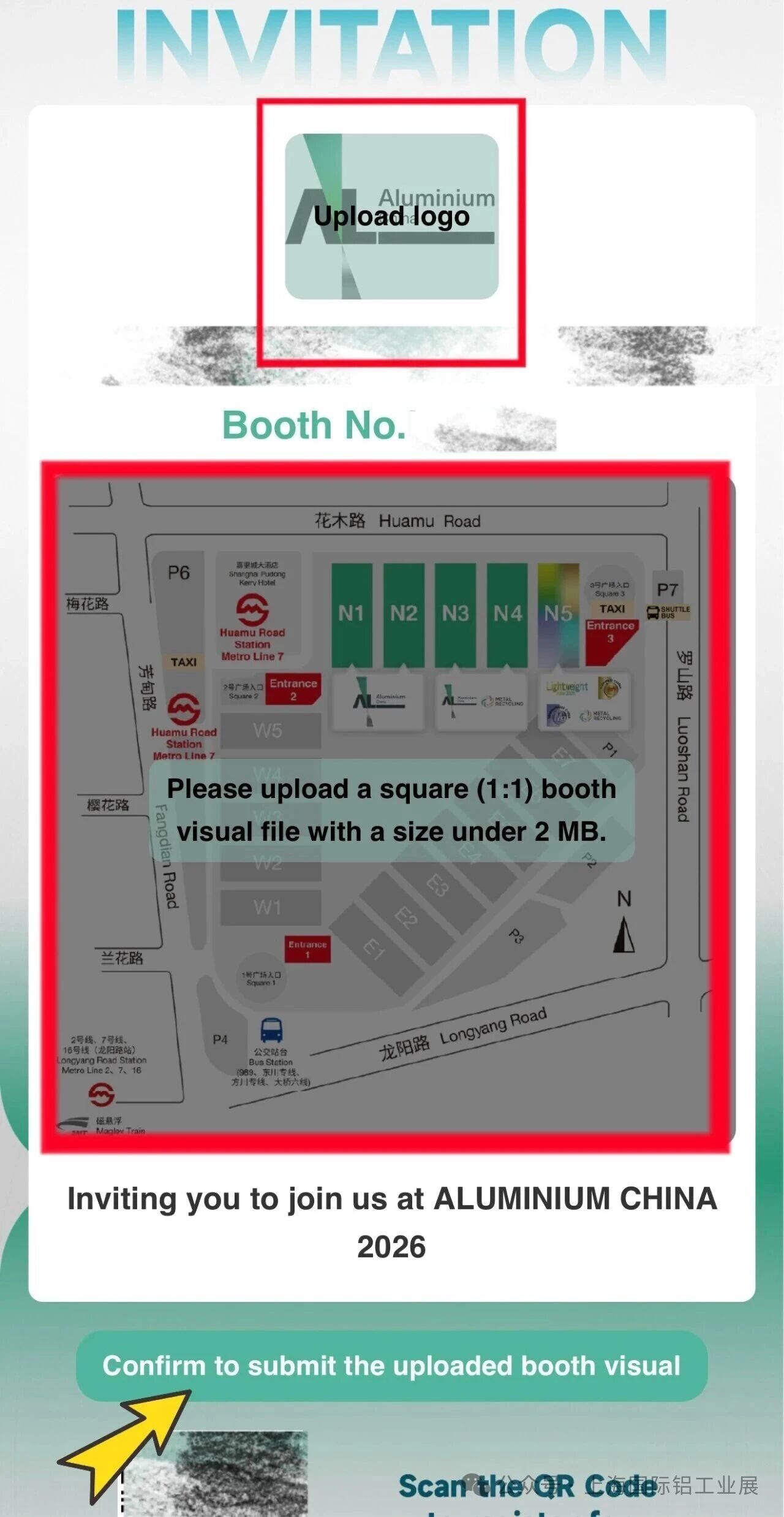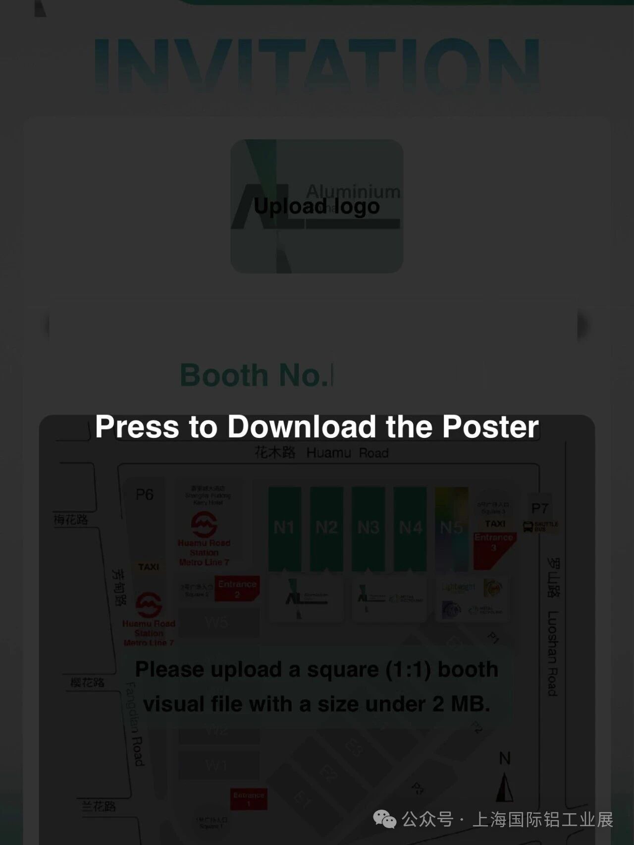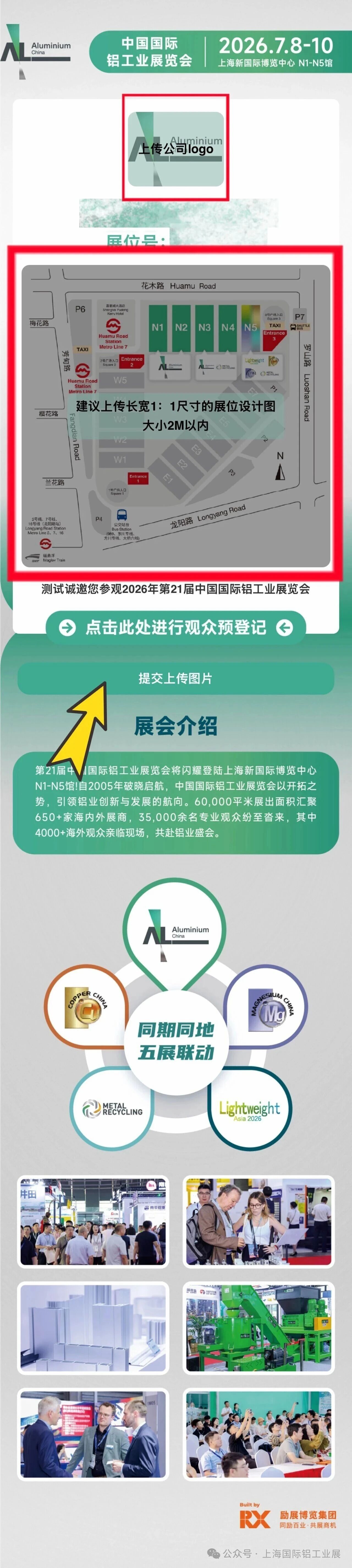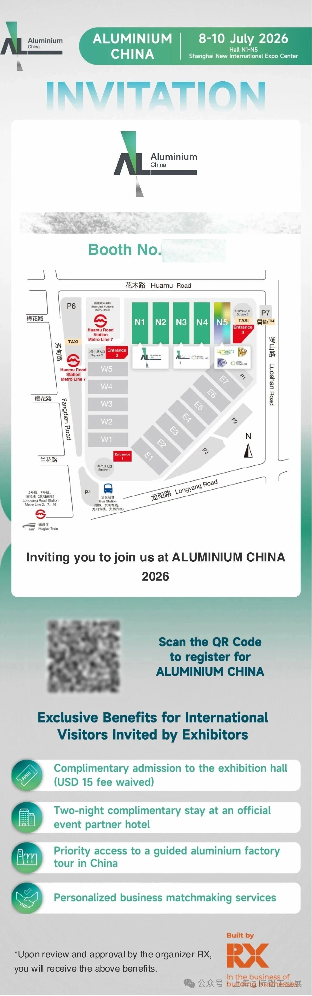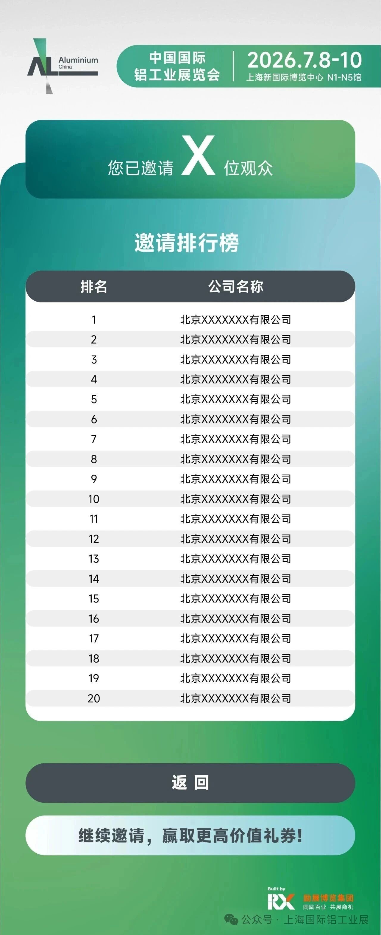 第21届中国国际铝工业展览会即将在沪盛大启幕!主办方特别推出展商专属邀观福利活动,诚邀您邀请海内外行业客户、合作伙伴及潜在买家共赴铝业年度盛会,共拓商机、共享行业发展新机遇! 展商个人福利: 邀请观众完成预登记,即可获得专属奖励:邀请 15–29 人完成预登记团长可获 588元激励金邀请 30–39 人完成预登记团长可获 888元激励金邀请 40 人及以上完成预登记团长可获 1688元激励金 展商企业福利: 邀请到场观众数量排名前三的企业还可额外获得价值 5300元微信公众号推文文尾 Banner 广告位(1个月) 如何定制您的专属邀请函?扫描头图二维码,进入活动页面即可生成专属邀请函: 中文版邀请函生成步骤:1点击“生成您的专属中文邀请函”2填写贵公司中文名称及您的姓名并提交3上传公司 Logo 及展位效果图(如无需替换,请保留默认图片)4通过右上角“...”分享邀请函链接至微信好友、朋友圈或行业社群 英文版邀请函生成步骤(助力高效邀约海外观众):1点击“生成您的专属英文邀请函”2填写贵公司英文名称及您的英文姓名并提交3上传公司 Logo 及展位效果图(如无需替换,请保留默认图片)4长按保存邀请函图片,分享给海外客户及社交媒体渠道如Facebook、Linkedin等 实时查看邀约成果点击“已有邀请函|查看我的邀约名单”,即可随时查看已成功邀约的观众数量。 即刻行动,邀请行业伙伴,共赴盛会! 2026年7月8–10日 上海新国际博览中心N1-N5馆精彩蓄势待发,期待与您现场相聚!本活动最终解释权归励展博览集团所有。展会结束后,主办方将与获奖者联系派送福利!