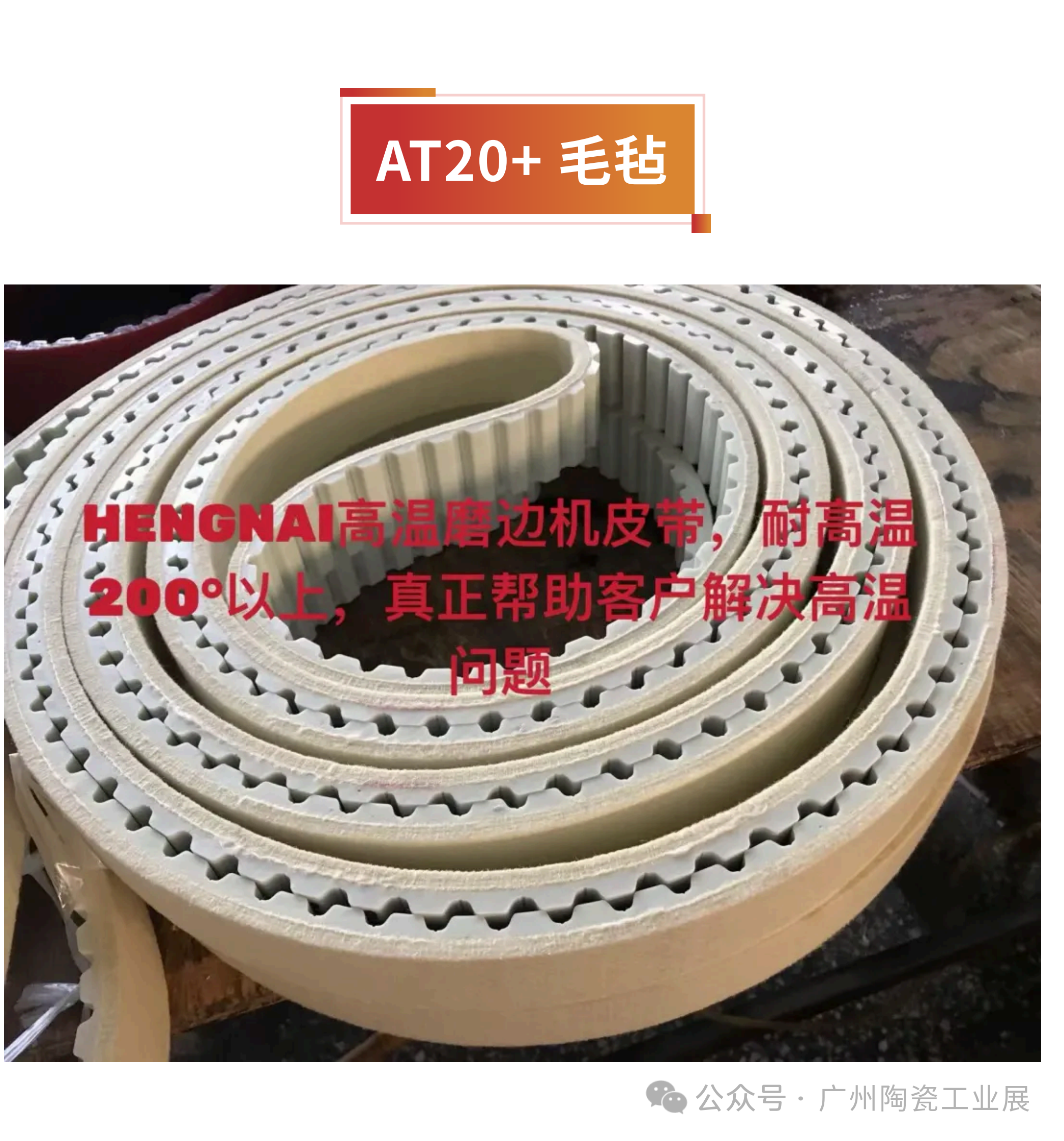 产品介绍:●AT20 同步带 +3/6mmAPL是一种聚氨酯(PU)材质、钢丝芯的工业同步传动带,属于梯形齿同步带,齿距20mm。用于陶瓷磨边机,玻璃磨边机等。●AT10 开口同步带是聚氨酯材质、钢丝芯的梯形齿同步带,齿距10mm。适用于料车磨边机等自动化设备。●38H+3/6APL150H是英制同步带,梯形齿+APL,广泛应用在陶瓷厂自动打包线上,速度快。●毛毡同步带 带导条毛毡同步带是在PU同步带(如T10/AT10/14M/8M)一体成型毛毡无缝同步带,优势在于耐高温(180°-280°-480°),永不分层,抗拉强度强,传动系数精准。●AT20+毛毡AT20+高温毛毡无缝一体成型的同步带,耐高温180度以上,适用于陶瓷厂干磨机和出砖没有降温直接进磨边机,耐高温,唯一能解决烂胶和分层的方案。公司介绍:佛山市恒耐工业传动设备有限公司,其产品适用于陶瓷,玻璃,纺织,喷绘,铝型材,自动化设备等机械所涉及到的同步带。产品远销印度,巴西及东南亚地区,广泛得到国内外客户的青睐。佛山市恒耐工业传动设备有限公司,将一如既往服务所有客户,同时感谢所有客户对本公司的信赖和支持。展会时间:6月24-27日第40届中国国际陶瓷工业展 【4.1馆 D251】 展会地点:广州广交会展馆A区#佛山市恒耐工业传动设备有限公司 盛邀您莅临!参观登记:个人参观请打开小程序进行登记团体参观请联系:萧小姐 ![]()