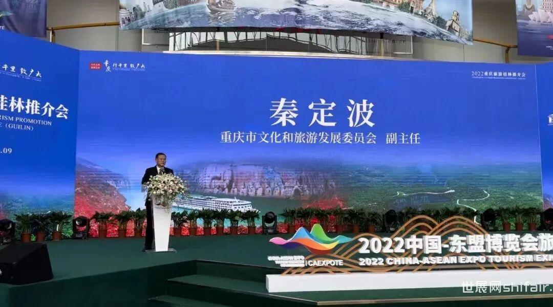 当天下午,2022重庆旅游桂林推介会在桂林国际会展中心中厅主舞台隆重举行。重庆市文化和旅游发展委员会副主任秦定波、广西壮族自治区文化和旅游厅一级巡视员唐正柱出席推介会并致辞,中共重庆市梁平区委常委、宣传部部长曹玲出席推介会并为幸运观众颁奖。秦定波副主任提到,渝桂两地山水相近,人文相亲,自然资源均富集而独特,文化艺术繁荣发展。重庆与南宁同为澜湄旅游城市合作联盟13个首批中方会员城市之一;重庆武隆喀斯特、南川金佛山与广西桂林、广西环江同属世界自然遗产—中国南方喀斯特的重要组成部分;重庆申报的川剧《江姐》和广西申报的新调剧《新刘三姐》近期双双斩获中国舞台艺术领域最高荣誉—文华大奖。希望渝桂两地进一步开展政策互惠、品牌互推、客源互送,共促两地旅游大发展大繁荣,共同谱写澜湄合作文化旅游新篇章。唐正柱一级巡视员提到,广西与重庆旅游资源互补性强。近年来,两区市文化旅游交流合作密切,感情深厚。希望桂渝两地进一步深化文旅交流合作,不断增强两地人民的感情,推动双方文化旅游共同发展。随后,重庆文旅推介人用“8D魔幻立体城市”“壮美长江三峡”“穿越古今武陵风光”“世界温泉之都”“热辣重庆火锅”等5个关键词带领观众认识重庆、玩转重庆、爱上重庆。梁平、大足、重庆武陵文旅融合发展有限公司分别代表“大三峡”“大都市”“大武陵”作精品旅游线路产品推介,并为嘉宾送出豪华游轮船票、火锅体验券、温泉酒店体验券、精品景区门票、精美文创产品、特色地方小吃等豪华文旅大礼包,将现场氛围推向高潮。此外,活动现场还正式上线“约惠重庆”重庆文旅消费周线上营销活动,旨在吸引更多海内外游客到重庆“打卡”游玩,此举也是疫情常态化防控背景下重庆积极创新营销思路、拓展推广渠道的一次有益探索。