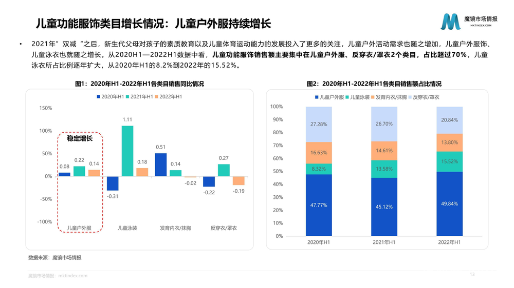 儿童功能服饰赛道分析儿童功能服饰市场整体规模及变化趋势:市场整体增速变缓,新品快速抢占市场。2021年上半年疫情得以缓解,居民消费欲望得到释放,儿童功能服饰市场在短时间内快速增长,仅从天猫淘宝数据来看,儿童功能服饰市场整体销售额增长29.45%,销量增长11.47%;2022年上半年,由于教育部2021年的“双减“政策,促使儿童户外活动增多,一定程度上刺激了户外功能服饰市场增长,但由于疫情反复,消费潜力并没有完全释放,导致2022年上半年儿童功能服饰销售额增速变缓。儿童功能服饰TOP10品牌竞争较为活跃,蕉内和蕉下凭借新品获得消费者青睐,快速抢占市场份额。