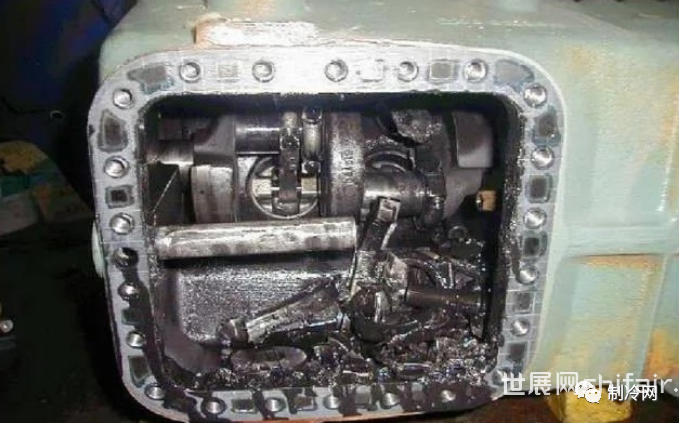 (2)、带液启动:回气冷却型压缩机在启动时,曲轴箱内的润滑油剧烈起泡的现象叫带液启动。带液启动时的起泡现象,可以在油视镜上清楚地观察到。带液启动的根本原因,是润滑油中溶解的以及沉在润滑油下面大量的制冷剂,在压力突然降低时突然沸腾,并引起润滑油的起泡现象。这种现象很像日常生活中,人们突然打开可乐瓶时的可乐起泡现象。起泡持续的时间长短与制冷剂的量有关,通常为几分钟或十几分钟。大量泡沫漂浮在油面上,甚至充满了曲轴箱。一旦通过进气道吸入气缸,泡沫会还原成液体( 润滑油与制冷剂的混合物 ),很容易引起液击。显然,带液启动引起的液击只发生在启动过程。与回液不同,引起带液启动的制冷剂,是以“制冷剂迁移”的方式进入曲轴箱的。“制冷剂迁移”是指压缩机停止运行时,蒸发器中的制冷剂以气体形式,通过回气管路进入压缩机并被润滑油吸收,或在压缩机内冷凝后与润滑油混合的过程或现象。压缩机停机后,温度会降低,而压力会升高。由于润滑油中的制冷剂蒸汽分压低,就会吸收油面上的制冷剂蒸气,造成曲轴箱气压低于蒸发器气压的现象。油温愈低,蒸汽压力越低,对制冷剂蒸汽的的吸收力就愈大。蒸发器中的蒸汽就会慢慢向曲轴箱“迁移”。此外,如果压缩机在室外,天气寒冷时或在夜晚,其温度往往比室内的蒸发器低,曲轴箱内的压力也就低,制冷剂迁移到压缩机后也容易被冷凝而进入润滑油。“制冷剂迁移”是一个很缓慢的过程。压缩机停机时间越长,“迁移”到润滑油中的制冷剂就会越多。只要蒸发器中存在液态制冷剂,这一过程就会进行。由于溶解了制冷剂的润滑油较重,它会沉在曲轴箱的底部,而浮在上面的润滑油还可以吸收更多的制冷剂。除容易引起液击外,“制冷剂迁移”还会稀释润滑油。很稀的润滑油被油泵送到各摩擦面后,可能冲涮掉原有油膜,引起严重磨损( 这种现象常称为“制冷剂冲刷” )。过度磨损会使配合间隙变大,引起漏油,从而影响较远部位的润滑,严重时会引起油压保护器动作。