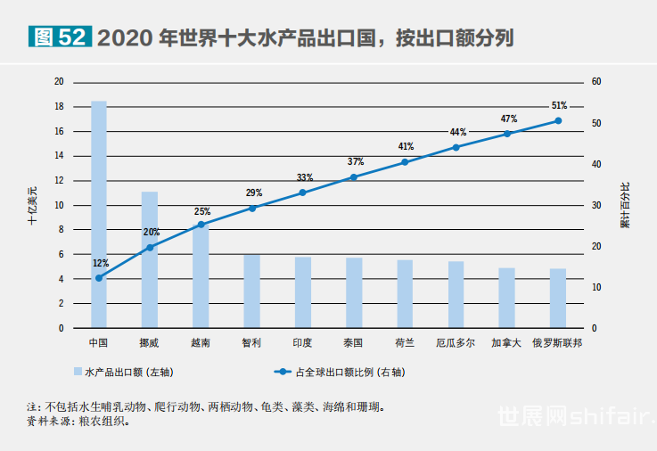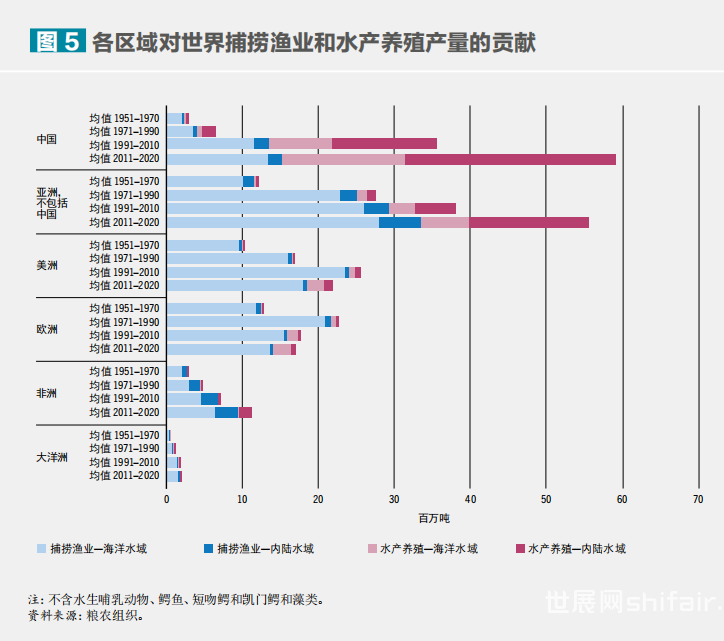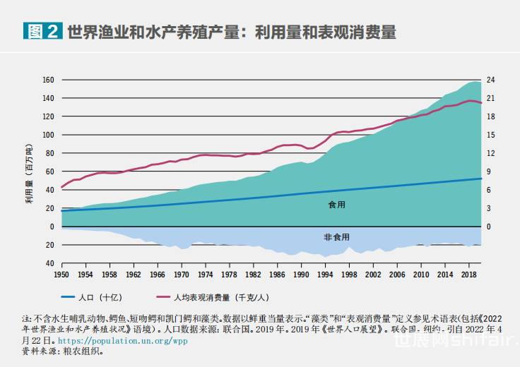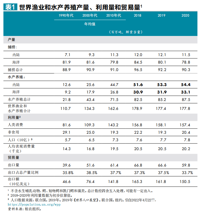 当前水产食品对粮食安全和营养的贡献之大前所未有。自1961年以来,全球水产食品(不包括藻类)的消费量以年均3.0%的速度增长,几乎是世界人口年均增速的两倍。人均年消费量达到20.2公斤,是20世纪60年代消费量的两倍多。尽管受新冠疫情影响,2020年仍有超过1.57亿吨水生动物直接供人食用,占水生动物产量的89%,略高于2018年的消费量。2019年水产食品约占动物蛋白消费量的17%,在中等偏低收入国家达到23%,在亚洲和非洲部分地区超过50%。2020年,亚洲国家渔业和水产养殖业的水生动物产量占全球总量的70%,其次是美洲、欧洲、非洲和大洋洲。中国仍然是最大的渔业生产国,其次是印度尼西亚、秘鲁、俄罗斯、美国、印度和越南。