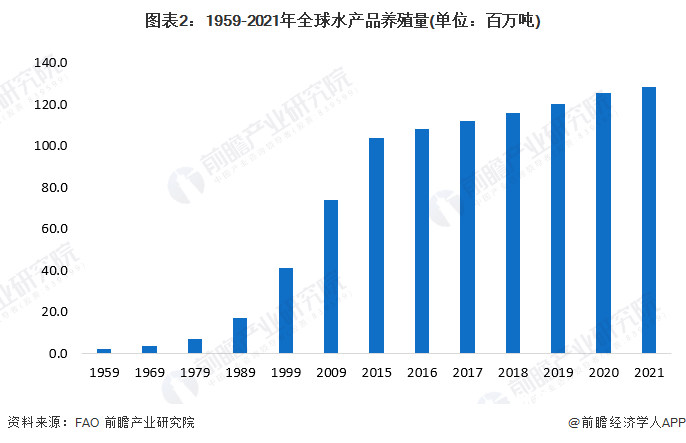 全球水产品养殖量呈现逐年上升趋势根据联合国粮食及农业组织(FAO)的数据显示,1959-2021年全球水产品养殖量呈现逐年上升趋势,自2015年之后,全球水产品养殖量增长率趋于稳定,初步统计2021年全球水产品养殖量约为1.28亿吨。
