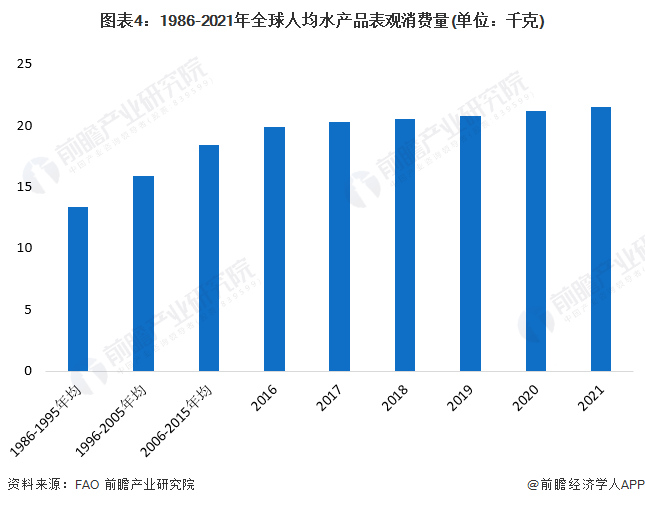 全球人均水产品表观消费量呈现上升趋势1986-2021年人均水产品表观消费量也呈现上升趋势,从1986-1995年均的13.4千克上升至2018年的21.2千克,初步统计2021年全球人均水产品表观消费量约为21.5千克。