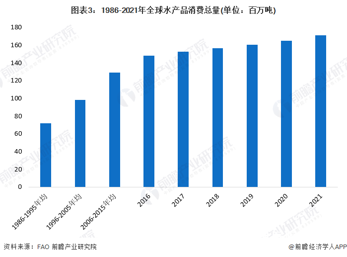全球水产品消费量呈现稳步上升趋势水产品是居民日常生活中优质动物蛋白的重要来源,具有高蛋白、低脂肪的优点,随着城乡居民消费升级,人们对营养、健康食品的需求不断增长。1986-2021年全球水产品消费总量呈现上升趋势,初步统计2020年全球水产品消费总量约为1.7亿吨。