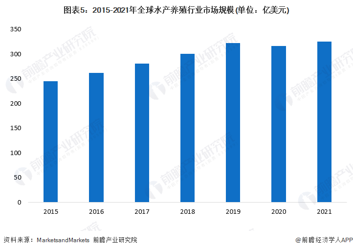 全球水产养殖行业市场规模整体呈现上升趋势在世界许多地区,鱼品能够促进粮食安全。很多发展中国家依靠鱼类作为主要的蛋白质来源,在其中的30个国家,鱼品占动物蛋白摄入量的45%以上。自1970年以来,水产养殖产量以平均每年8.7%的速度增长。在2020年,由于新冠肺炎疫情的影响,全球水产养殖行业受到一定程度的影响;由于产品滞销导致积压的活鱼数量增加,提高了饲养成本和活鱼死亡风险,鲑鱼等生产周期较长的行业无法针对需求变化迅速做出调整,从而水产养殖行业市场规模将有一定程度的下跌。随着疫情逐渐恢复,2021年全球水产养殖行业也逐步恢复,初步统计2021年全球水产养殖行业市场规模将超过320亿美元。