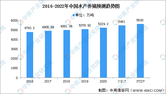 我国水产养殖业快速发展随着我国经济持续健康增长、城乡居民收入和城市化进程提高,人民生活水平不断提高,膳食结构也逐步改善,人们对水产品的需求量处于逐年增长态势,对品质好、价格高的水产品的需求量也越来越大,直接推动了水产养殖业的快速发展。中国水产养殖从2016年的4793.2万吨增长至2020年的5224.2万吨,年均复合增长率达2.18%,预计2022年将进一步增长至5630万吨。