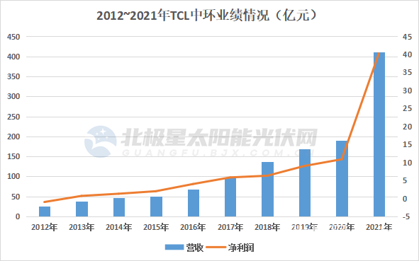 接下来的故事尽人皆知,以第一性原理为基,单晶迭代加速。与此同时,同步扩张还有隆基的单晶产能和产品出货量。截止2021年底,隆基单晶硅片产能达105GW,较2014年增长 340%。而组件业务,2018年组件出货量跻身全球前五,2020年摘得首席王冠,成为硅片、组件“双冠王”。深耕疯狂内卷及技术迭代迅速的光伏制造环节,隆基硅片“护城河”高矗,新一代电池技术独树一帜,后续故事仍然值得期待。3、中环与隆基共列硅片“双雄”,中环的故事同样跌宕起伏。特别是2020年,混改完结,TCL集团入主,中环由国企变身民企,至此开启中环“加速度”。2021年中环营收、净利润双双创新高,营收同比增长116%实现411.05亿元,净利润同比增长270%。