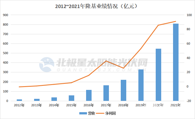 坐稳多晶硅、太阳能电池龙头位置,以及加速下游渔光互补电站开发,通威的开疆拓土并未停止,并且率先走出了产业链一体化的“通威模式”。2019~2021年,通威先后与隆基、天合、晶科达成深度“联姻”,参股投建拉棒、切片、电池片项目。2022年,通威组件布局更是“一石激起千层浪”,先后拿下华润电力、国家电投、大唐等央国企订单,搅局组件市场。据通威相关人士透露,2023年通威组件产业将由去年的14GW狂飙至80GW,冲击超一线的决心十足,至此,贯穿光伏全产业链的通威帝国也呼之欲出。2、隆基人送“光伏茅”、国内市值最大的光伏专业厂商,隆基绿能的影响更加深入人心。从2012~2021年,十年隆基营收增长4638%,净利润增长16620%。