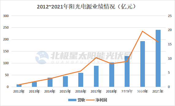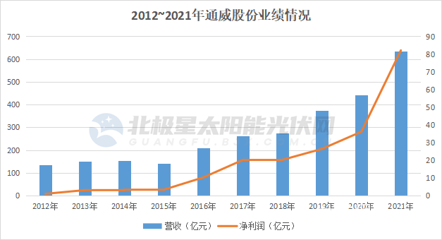 来源:北极星太阳能光伏网(独家)头顶未来能源“桂冠”,光伏赛道狂飙且吸引力十足。与此同时,光伏同样是周期性行业的典型代表之一,技术迭代、市场厮杀、贸易壁垒……身处其中,光伏企业披荆斩棘,发展难度与日俱增,但穿越周期的明星企业同样高高矗立。(注:以下企业顺序按照产业链顺序进行,无关排名。)1、通威作为光伏中上游企业,通威的影响举足轻重。早在2006年,笑傲水产饲料及畜禽饲料行业的通威集团投资永祥股份进军多晶硅行业。2013年,通威集团收购合肥赛维,将光伏产业链再次向下延伸至太阳能电池。2016年,通威集团旗下上市公司通威股份通过并购重组将光伏优质资产纳入主营业务,至此形成了“渔业+光伏”两大主业资源整合、协同发展的经营模式。2012~2021年近十年,通威股份经营业绩稳步上扬,营收增长371%,净利润增长8450%。