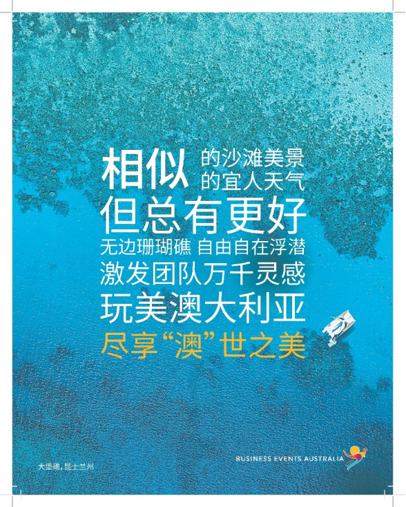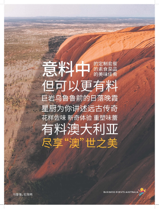 01通过市场营销活动,提升澳大利亚作为商务会奖旅游目的地的知名度澳大利亚旅游局商务会奖部于2023年2月1日发起了全新品牌宣传活动,向大中华区的会奖活动策划者和决策者展示澳大利亚无与伦比的商务会奖资源。这也是将澳大利亚定位为会奖目的地全球领先者这一更远大战略中的重要一步。“过去的三年间,我们一直积极向来自大中华区的商务会奖客户推广澳大利亚,随着双向免隔离旅行的恢复,现在更是近一步加强沟通,唤醒客户对澳大利亚记忆,让澳大利亚成为他们选择下一次商务会奖活动目的地的最佳时机。” 何安哲先生强调说,“澳大利亚拥有独特壮丽的景色,提供特色风情的体验以及当地人的奇思创意,堪称令人向往的目的地之选。我们相信,澳大利亚能够满足企业对于商务会奖活动目的地的所有期待,以及更多超越期待的惊喜。”