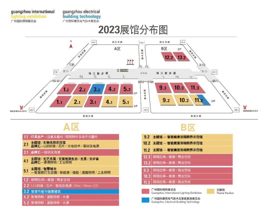 2023年GILE将联合广州国际建筑电气技术展览会(GEBT),共占据中国进出口商品交易会展馆的18个展览馆,当中包括A区(1.1至5.1及1.2至5.2)及B区(9.2至13.2及9.3至11.3)。A区将聚焦城市、新能源、工业、光艺术、家居与商业应用、照明生产技术、封装、光电技术及相关配件题材;B区则聚焦智能照明供应链,人工智能物联网(AIoT)及室内多样场景及空间设计。