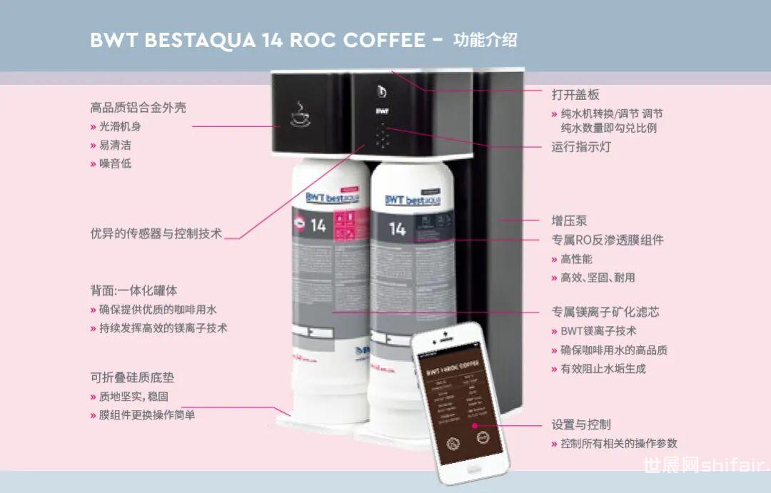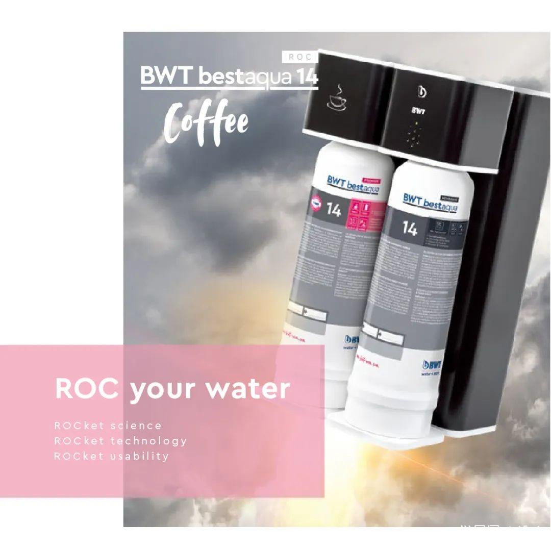BWT bestaqua 14 ROC Coffee可调式纯水机,镁离子专利技术与反渗透技术创新结合。流量2L/min,总净水量60000升;超滤、反渗透、镁离子三合一任意比例可调;蓝牙连接,APP手机全方位监控。有效保护咖啡机、蒸烤箱等高端涉水设备,显著提升饮品、食物的口感,带来与众不同的感官体验!