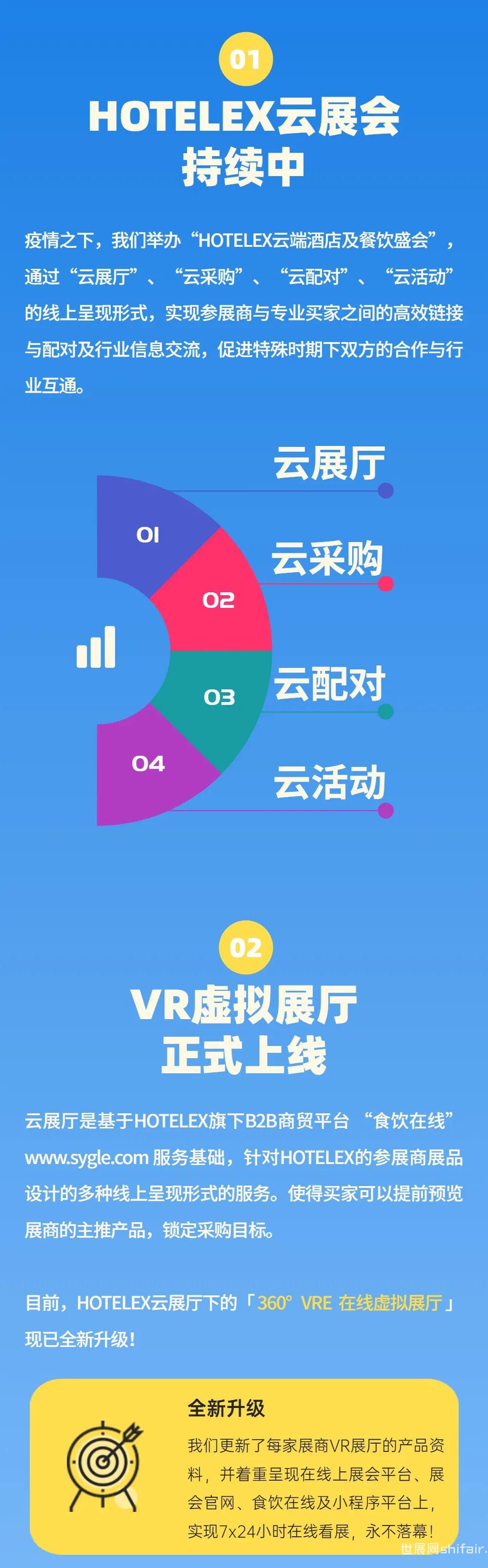 HOTELEX线上展会4大云板块,自3月28日起,我们致力于将时间持续至8月份线下展开展。期间,以上线上各栏目欢迎大家踊跃报名!