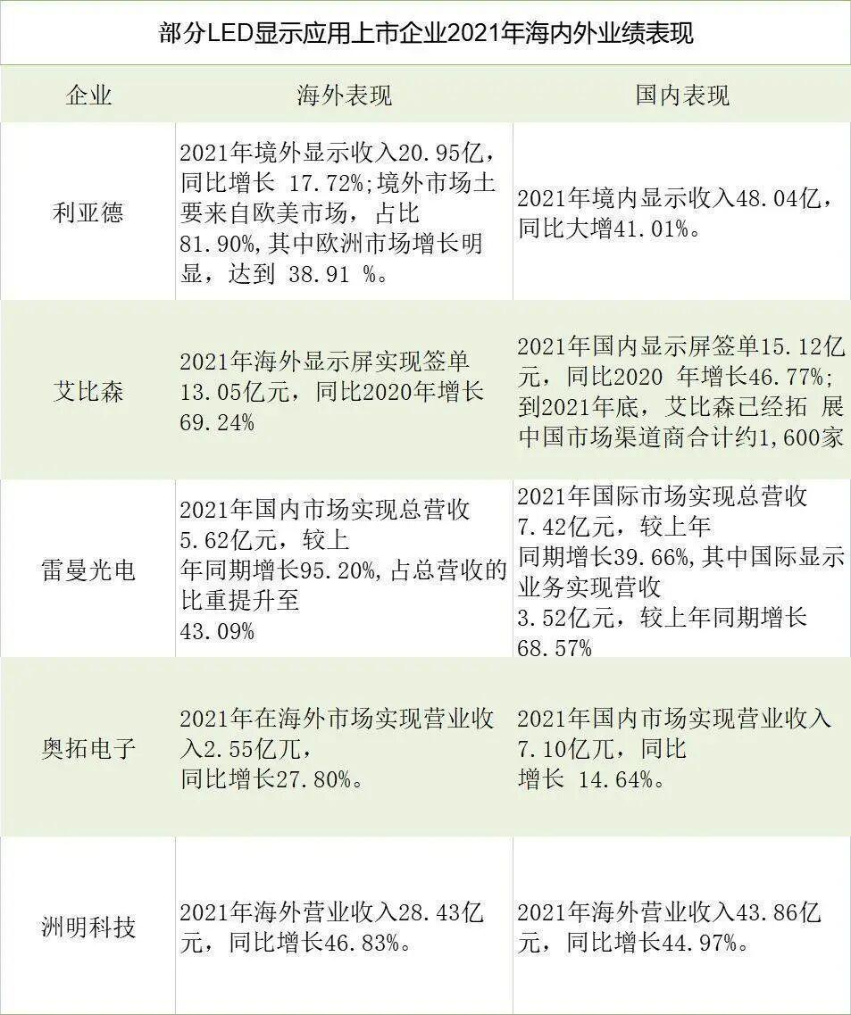 02.行业趋势:海外市场恢复,新赛道持续发力五家LED显示屏企业的财报中,除了呈现了各自的亮点之外,通过整合对比各家的财报信息,还可以发现一些共通之点,一定程度上反映了2021年LED显示屏行业的整体发展趋势。海外市场恢复,国内外市场齐发力自全球疫情爆发以来,各国加大了对出入口贸易的管控,原材料进不来,商品出不去,这对LED显示屏企业的海外市场来说,冲击力极大。在2020年四家企业营利均出现大幅下降,各大显示屏厂为了尽量减少疫情对业绩的影响,均重视国内市场。2021年疫情逐步控制,海外市场也逐步开放,这四家企业的年报中,均有提到海外市场复苏对业绩增长的作用,LED显示屏市场呈现海内外双开花局势。具体表现如下:
