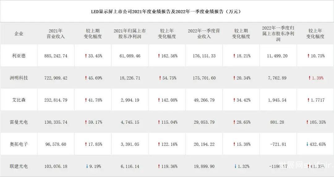 截至到四月底,大部分上市企业都披露了2021年年报。其中,在A股上市的利亚德、艾比森、雷曼光电、洲明科技、奥拓电子及联建光电六家LED显示屏企业也交出了自己的年度“成绩单”,在疫情步入常态化的这一年,这几家企业表现如何?整体上体现了哪些行业趋势?01.总体表现:营利双增,净利润增幅超一倍