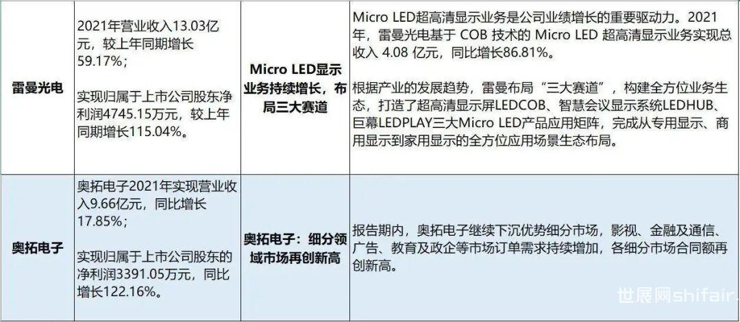 2021年,奥拓电子积极应对外部环境不确定因素,一方面挖掘市场机会,巩固优势细分市场地位,在影视、广告、政企及金融等市场均取得较好成绩;同时组建内容团队,积极开拓虚拟数字人、裸眼3D、沉浸式数字直播间等新市场,提升公司数字内容能力;另一方面,持续推动智能视讯技术的创新,强化“硬件+软件+内容”相结合的一站式解决方案能力。2021年,计提商誉减值的金额较小,新产品、新市场及新业务推动公司业绩增长,实现扭亏为盈。洲明科技小间距LED产品进入性价比最优阶段面对外部形势变化,公司抢占先机,积极开展产业上下游协同合作,与头部供应商签订战略采购协议,调节供需平衡,同时把握市场格局,提升市场占有率;扩产产能,前瞻性投入,使公司整体产能实现大幅跃升,迅速响应客户需求,及时足量供货,全面提升公司市场占有率,进一步夯实公司在全球市场的领先地位;持续推进数字化智能化生产信息管理,对标国内外先进智能制造运营管理建设,实现精准数据对标,消除难点、堵点、痛点问题,提升生产运行管控能力,加大节能技术改造力度,持续优化能耗指标,努力实现降本增效的目的。具体表现如下: