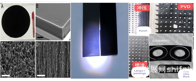 应用进展超黑吸光消光纳米薄膜有广阔的应用前景。由于超高的吸收率,可以几乎完美吸收可见光和红外光,避免各种无用反射光,消除有害杂散光,吸收全部光能,这些特性可以在精密光学仪器和光学零件、激光雷达、镜头成像、红外成像、红外传感、机器视觉与检测、视觉识别、医学影像光学器械、光伏太阳能、光电光热系统、散热管理、发热材料,以及外观装饰和美学欣赏等产品上得到广泛使用,可以大幅度提高产品的品质,增加产品的吸引力,开拓新的产品方向。通过在这些产品上的应用,超黑吸光镀膜将广泛地进入到以下领域:光学镜头及成像、车载激光雷达、机器视觉、精密光学仪器、医疗仪器、LED显示屏、航空航天、军事工业、太阳能、笔记本电脑、手机、智能穿戴、手表首饰、超黑玻璃等领域。