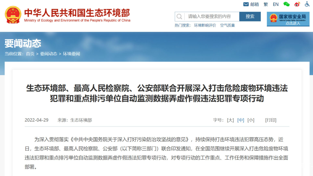2021年4月底,3部门再次联合印发通知,要求即日起在全国集中开展为期6个月的专项行动,这一次则把“打击重点排污单位自动监测数据弄虚作假违法犯罪”也加入了进来。