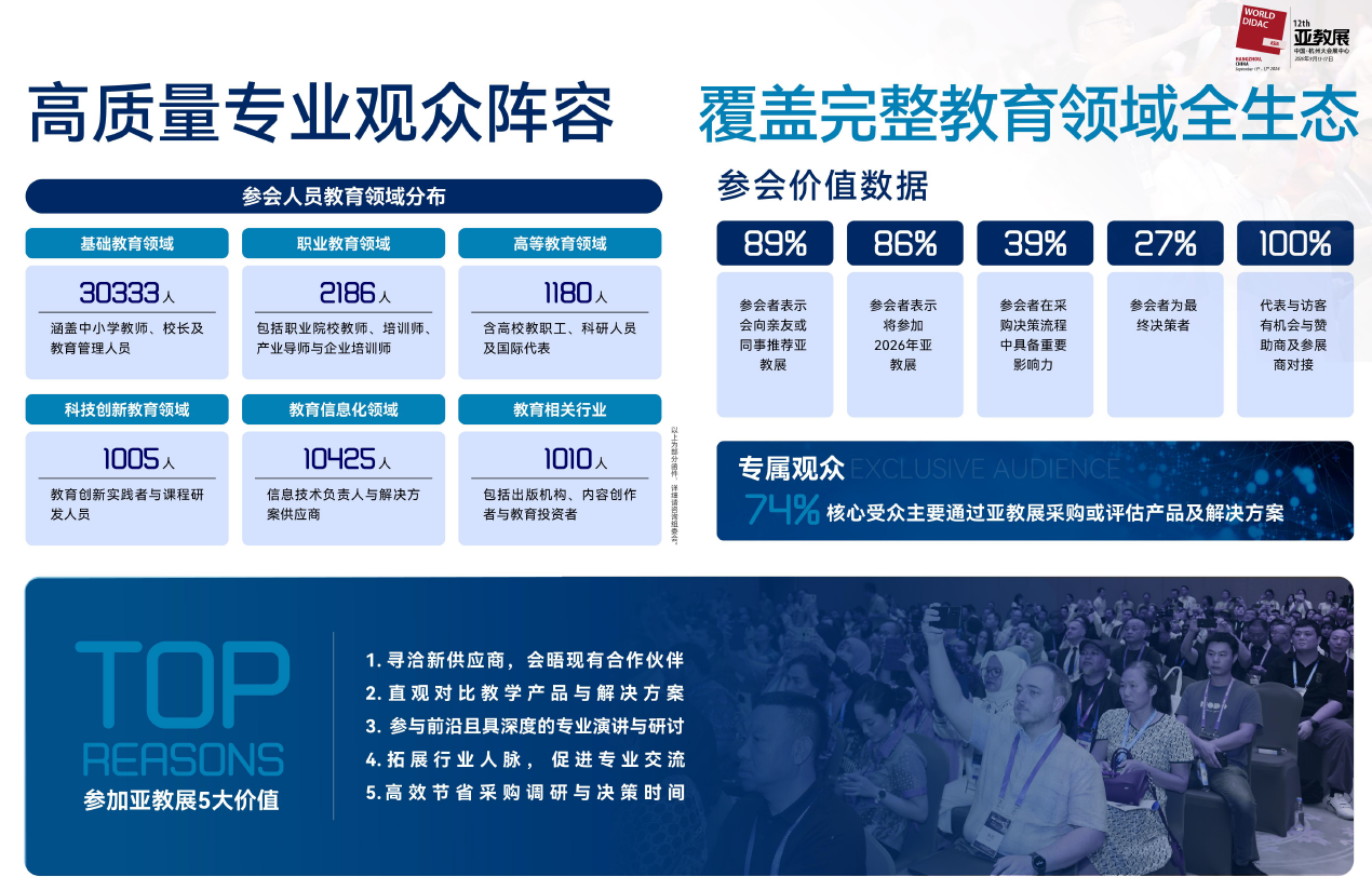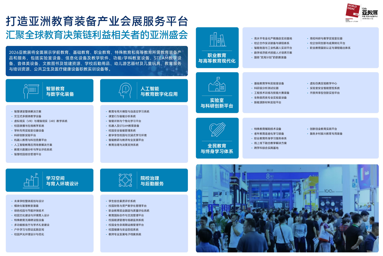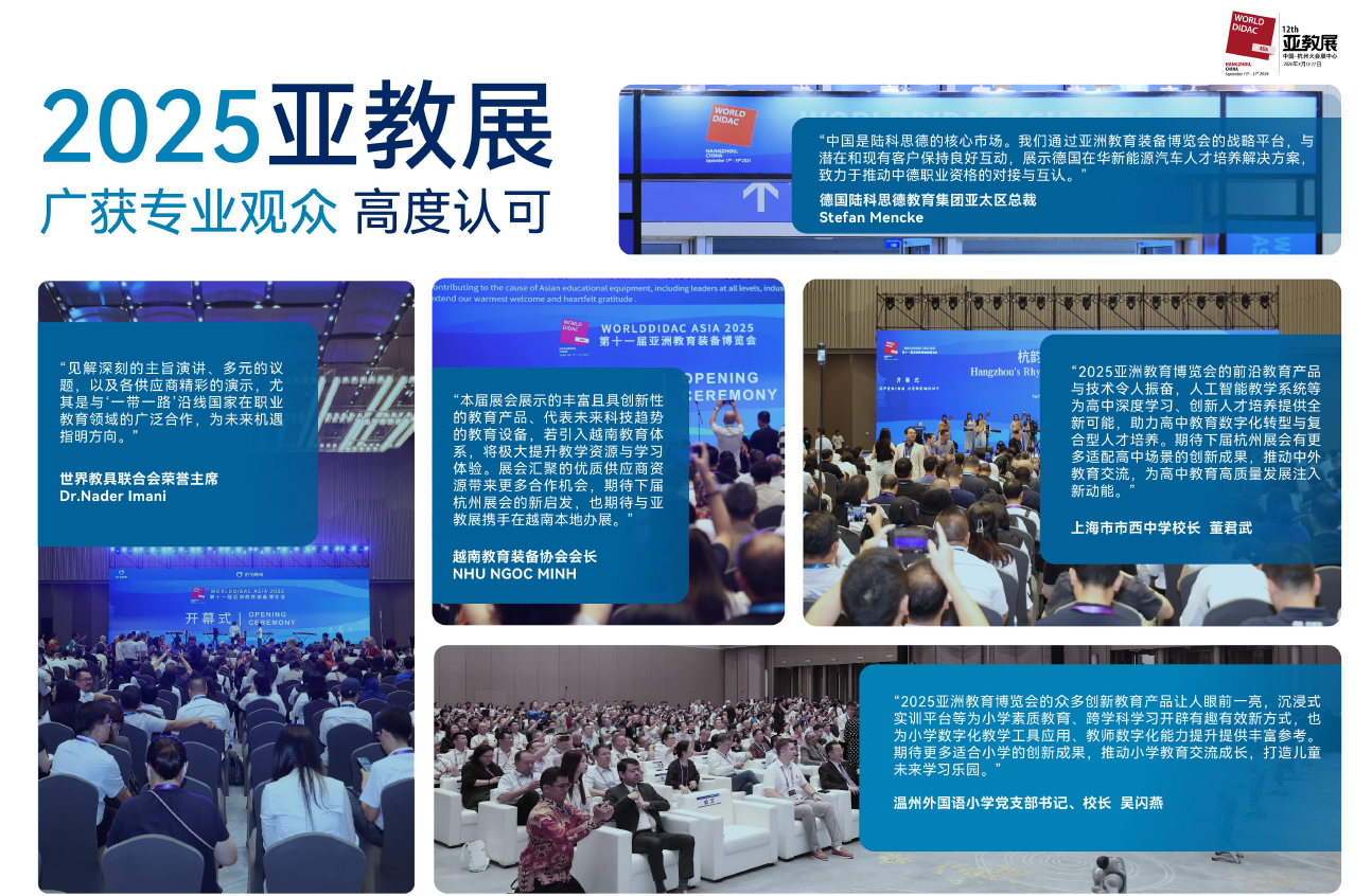 每年秋季,杭州亚洲教育装备博览会(Worlddidac Asia)近30000名教育类企业供应商、学者专家、院校机构、移动应用开发者、授权商和被授权商、教学软件设计公司、代理商、分销商、品牌代表、政府以及教育从业者都会聚集在Worlddidac Asia,在数千个展位上体验教育装备和教育技术产品的全教育链盛宴。