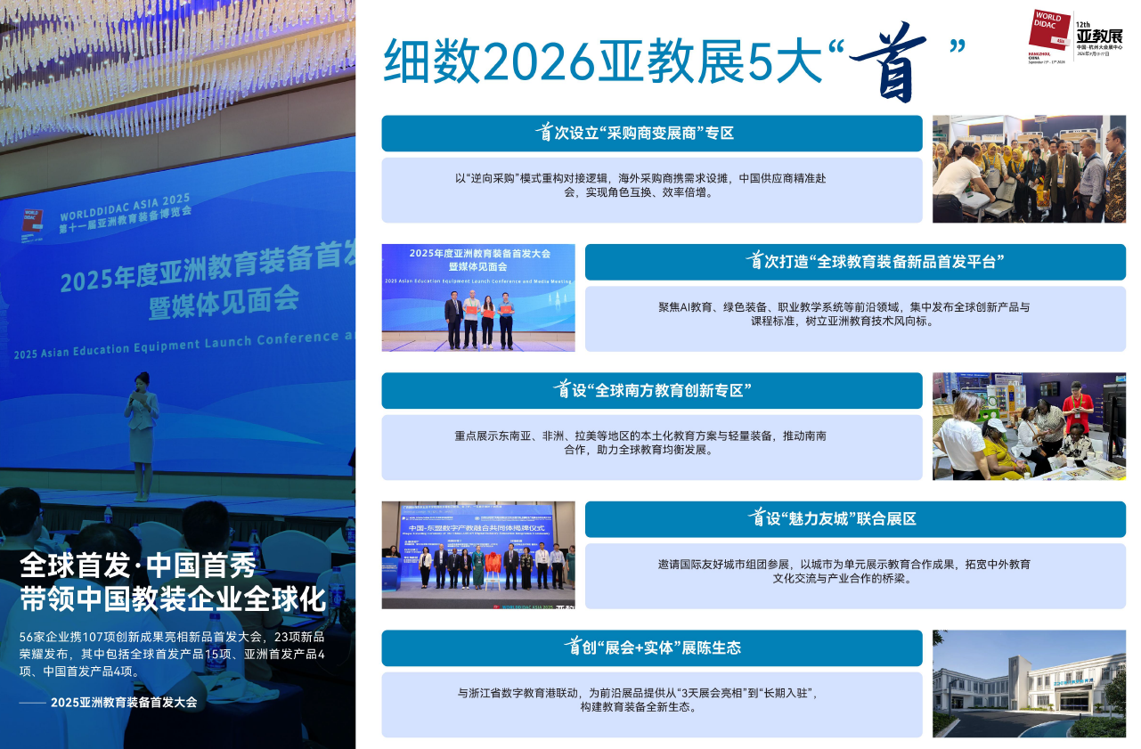 杭州亚洲教育装备博览会(Worlddidac Asia)贯穿国际教育、学前教育、基础教育、职业教育、高等教育、特殊教育与继续教育全教育链生态体系。构建完善的国际教育合作与交流体系,包括设立国际分支机构、搭建国际合作网络、参与国际教育组织等,为教育出海提供坚实的组织保障和平台支撑。